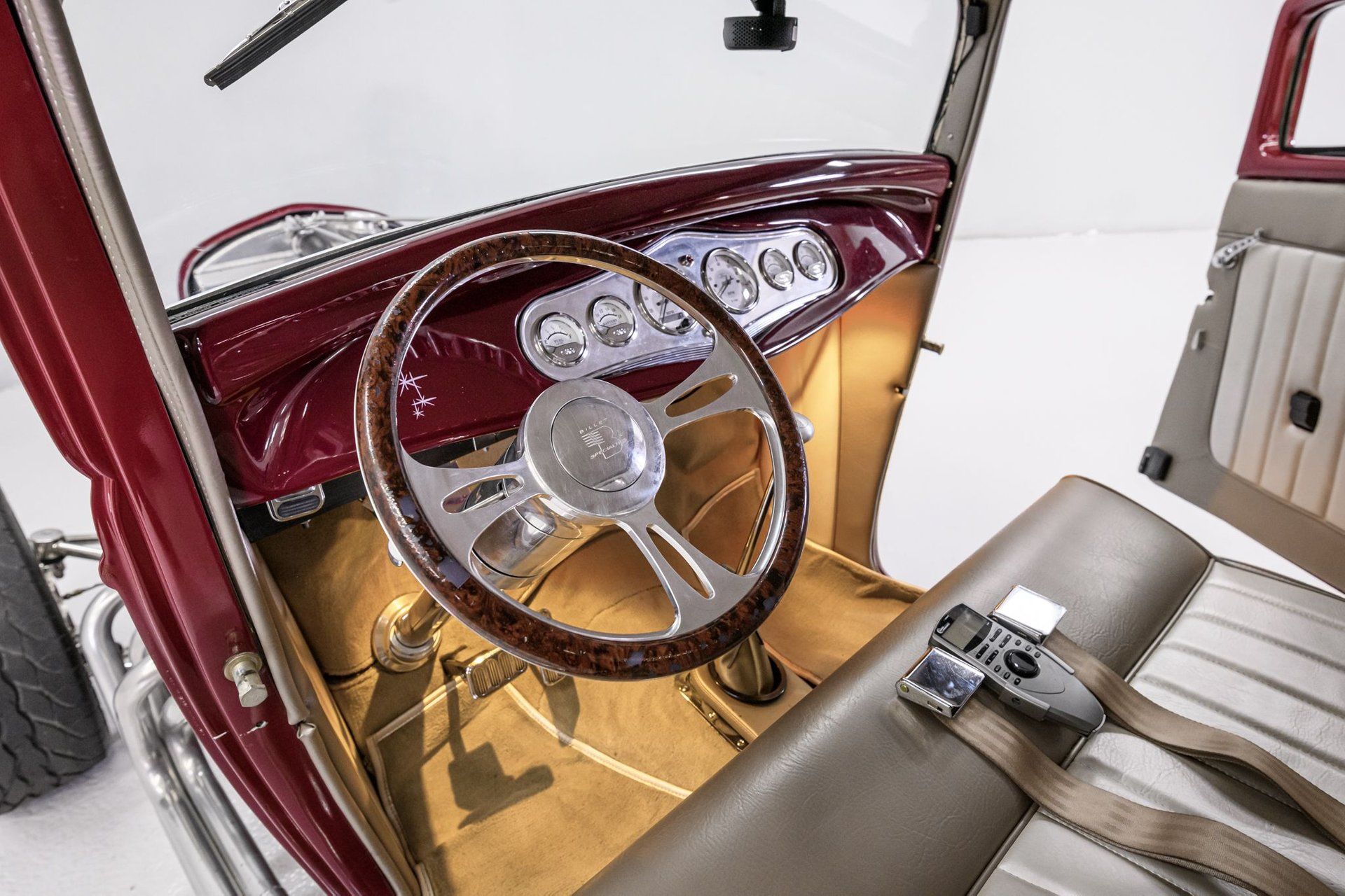 If you plan to build a top-shelf street rod, you must begin with a vision. You must then execute every detail carefully with the best components available. When done correctly, the result will be in a class with this 1932 Ford 'Deuce Coupe'. The Model B 'replica' utilizes a 3-window fiberglass body, Ford/Heidts drivetrain and custom Heidts suspension. The professional Burgundy finish is exceptional and fits the build perfectly. There is no hood, no engine side covers, no fenders and a pair of suicide doors – pure. The Billet Specialty alloys (16”f/18”r) mount BFGoodrich G-Force T/A radials and a pair of low, shock-mount headlight assemblies flank the deuce grill. The interior is upholstered in 2-tone tan vinyl with matching door cards and headliner - it is stunning. The classic dash contains a polished insert and full set of AutoMeter white-faced gauges. A Billet Specialties alloy/wood-accented wheel is mounted on an tilt column and tunes are provided by a SecretAudio AM/FM sound system w/Bluetooth/remote that is tucked carefully under the seat. Other convenience features include power windows, power trunk and a Dash Cam. A Ron Francis wiring harness takes the guesswork out of the electrics. Horsepower is furnished by a high-performance Ford 289ci crate motor that is fitted with an Edelbrock intake and Holley 4V carburetor. Tube headers and side pipes are ceramic coated and an aluminum radiator w/electric fan manages cooling. Behind this 'Windsor' sits a Ford C-4 automatic transmission w/Lokar shifter. The painted/detailed chassis is fitted with Heidts suspension components front and rear. A power rack/pinion steering system is integrated into the front coil-over suspension package and the polished independent rear suspension is a multi-link design w/radius rods, half-shafts and coil-overs. The posi-traction differential is fitted with street gearing and power assisted 4-wheel disc brakes provide stopping power. Receipts of the build are included in the sale. This classic 'Little Deuce Coupe' will become a centerpiece in your Blue Oval garage.