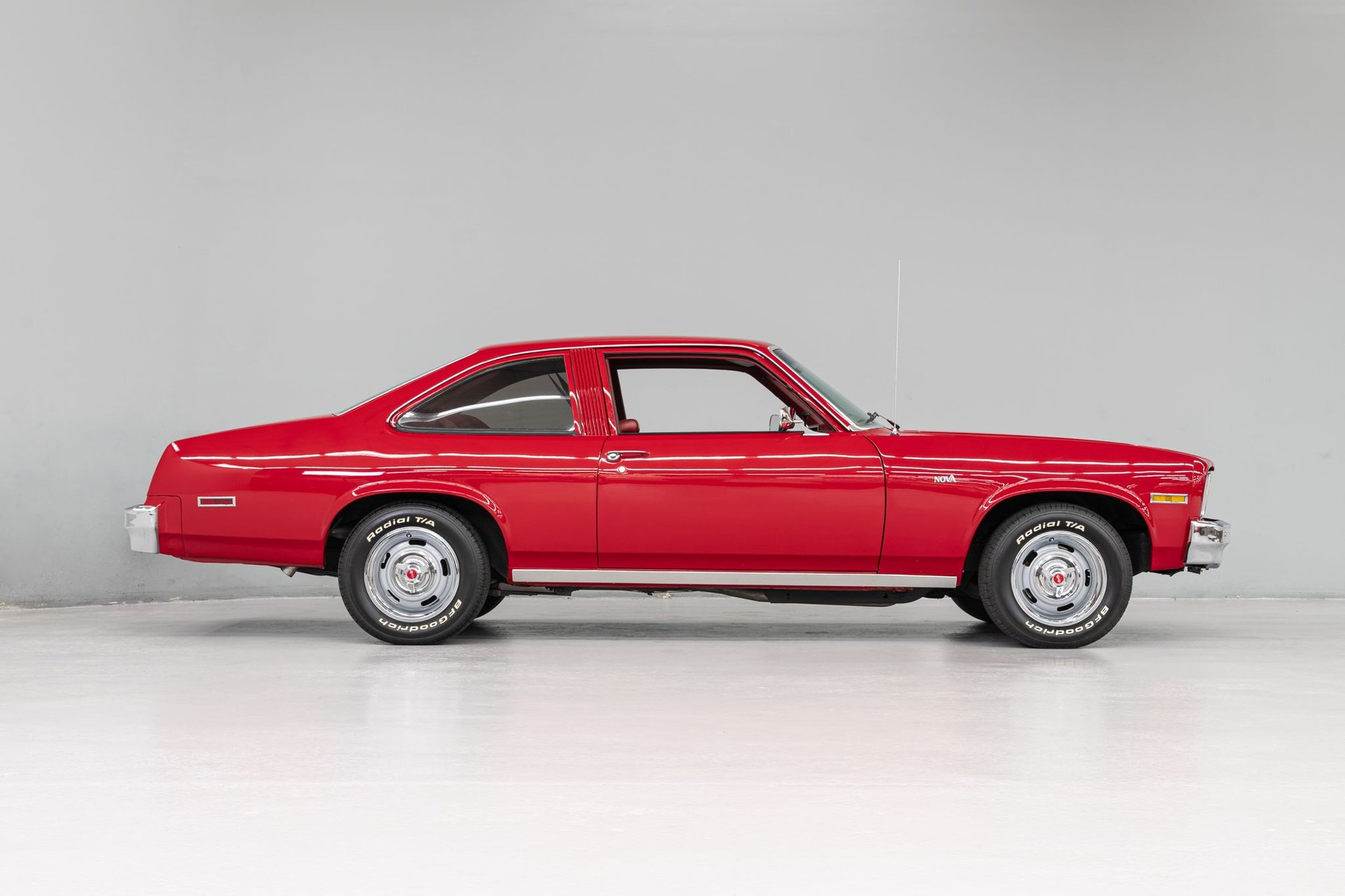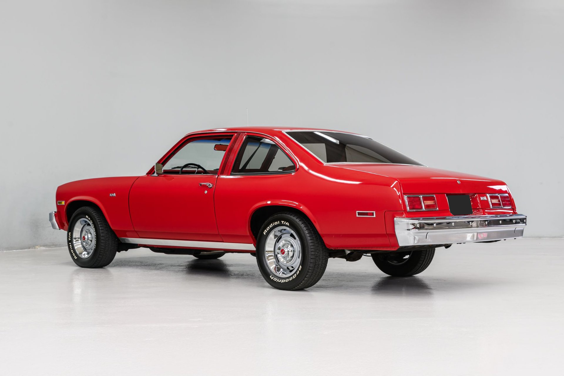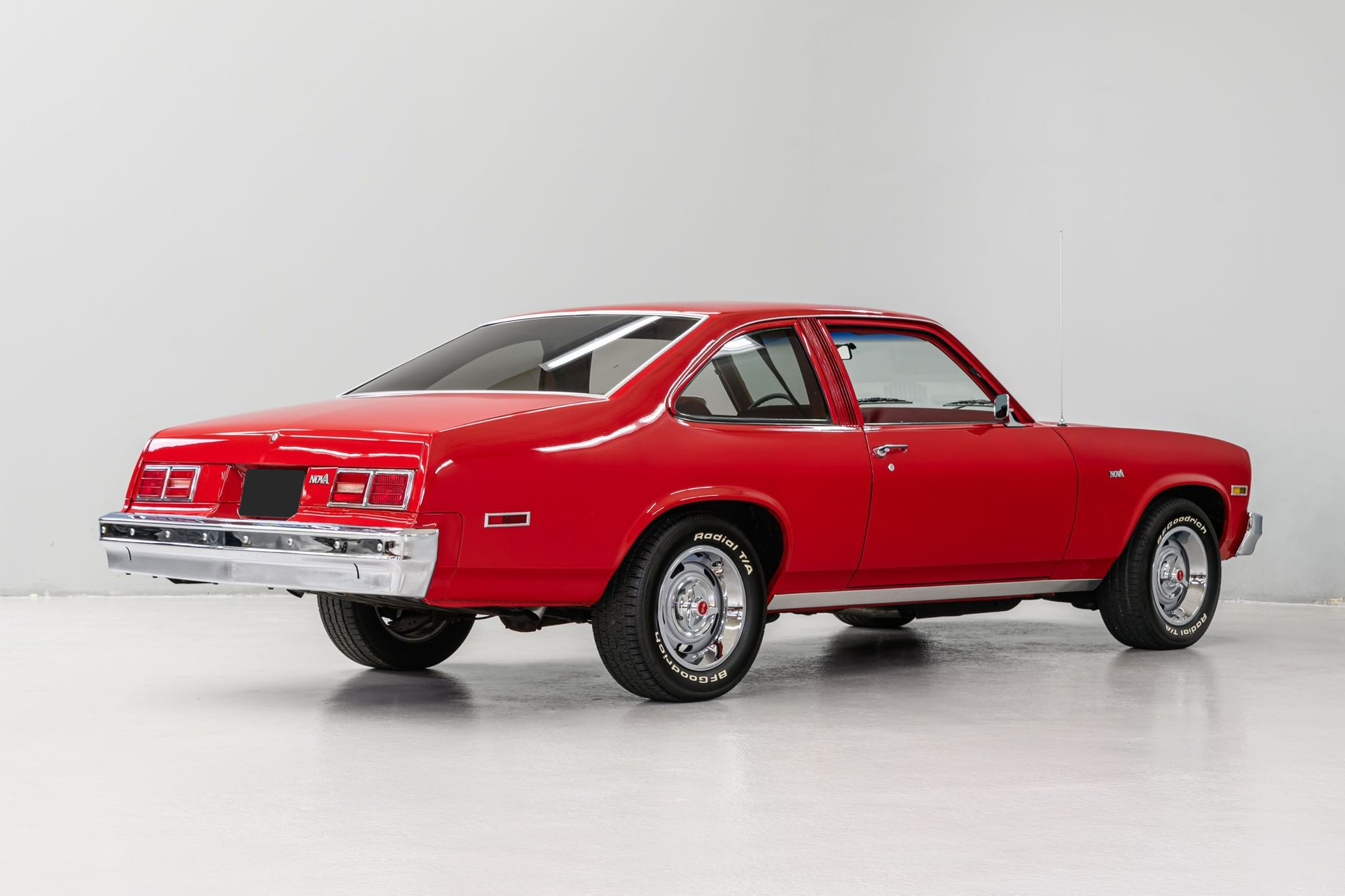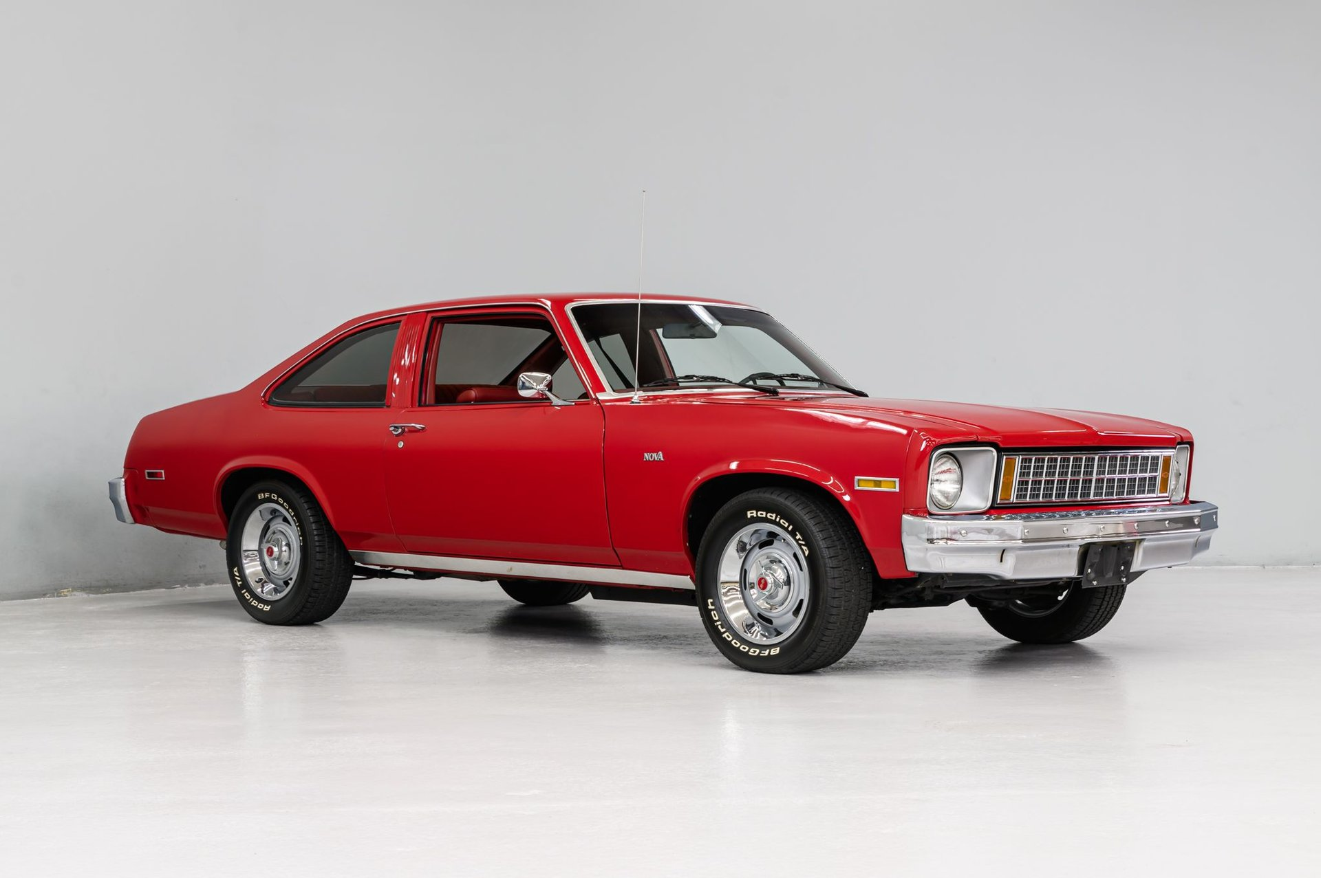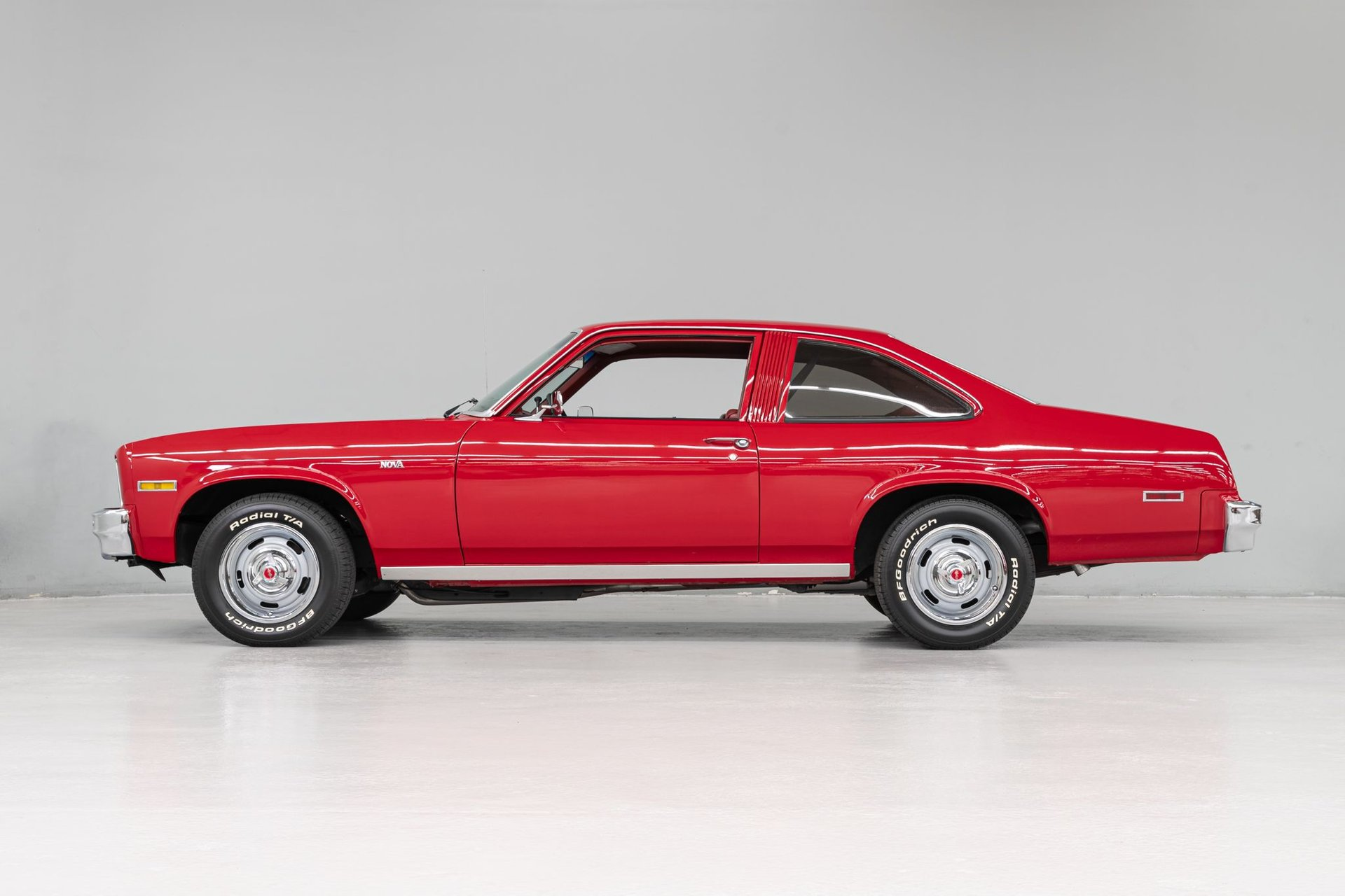 This 1976 Chevrolet Nova began life as a mundane 2-door post, but has been transformed into a performance coupe in the image of the Chevy Nova SS 350 muscle car of the late 60s. The Nova received a full restoration with mechanical upgrades (2018) and the owner states that the mileage shown (just under 58,000) is believed to be actual. The exterior was professionally refinished in 2-stage GM Torch Red and is in excellent condition. Chevy Rally wheels with trim rings/spinner centers mount 15” BFGoodrich Radial T/A tires and all chrome is excellent. The red cloth interior was carefully restored and is quite compelling. Dash, door cards, tinted windows, carpeting and headliner are all in excellent condition. A full set of SunPro gauges has been installed and an aftermarket AM/FM sound system furnishes tunes. That said, horsepower is the real story of this Nova. The original 305ci/2v (Q code) engine is long gone, replaced by a L98 350 Corvette motor that sounds awesome. It is equipped with aluminum heads, nice street cam, Edelbrock Performer EPS aluminum intake, Edelbrock 4V carburetor and stainless tube headers that exit to a free-flowing exhaust system. The motor sits in a spotless engine compartment with nice chrome accessories. Torque is delivered through a 350 TurboHydramatic 3-speed gearbox to a stout GM 10-bolt differential. The chassis is fitted with power steering, power disc/drum brakes w/dual master and front sway bar. This '76 Nova has been carefully restored and is truly a Chevrolet 'Perfect Sleeper'.