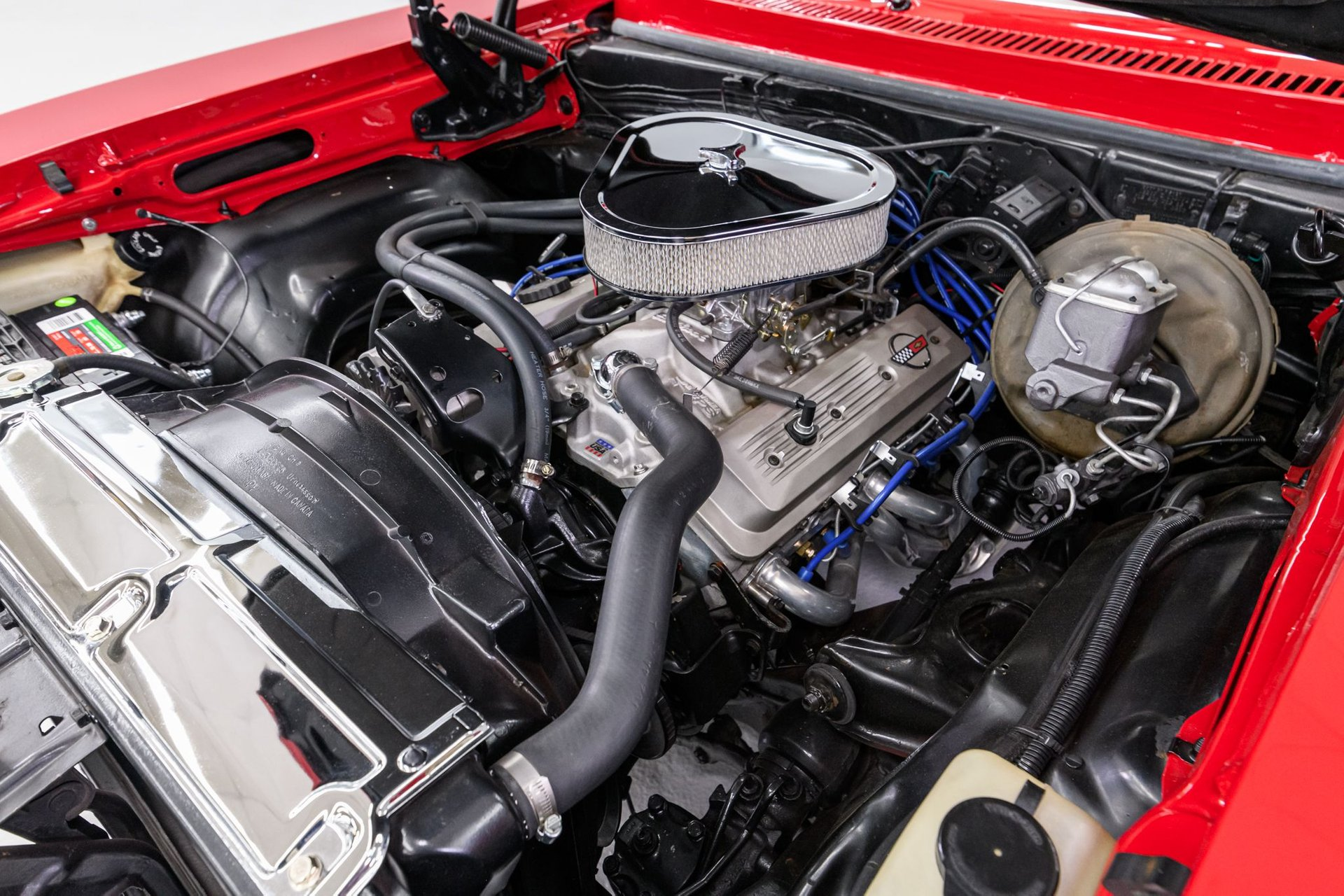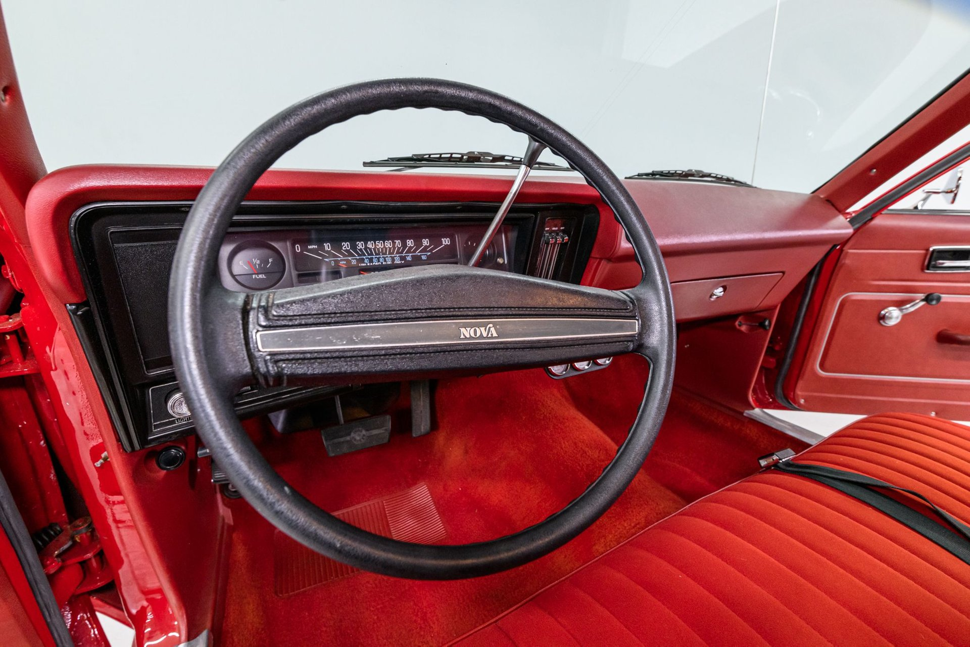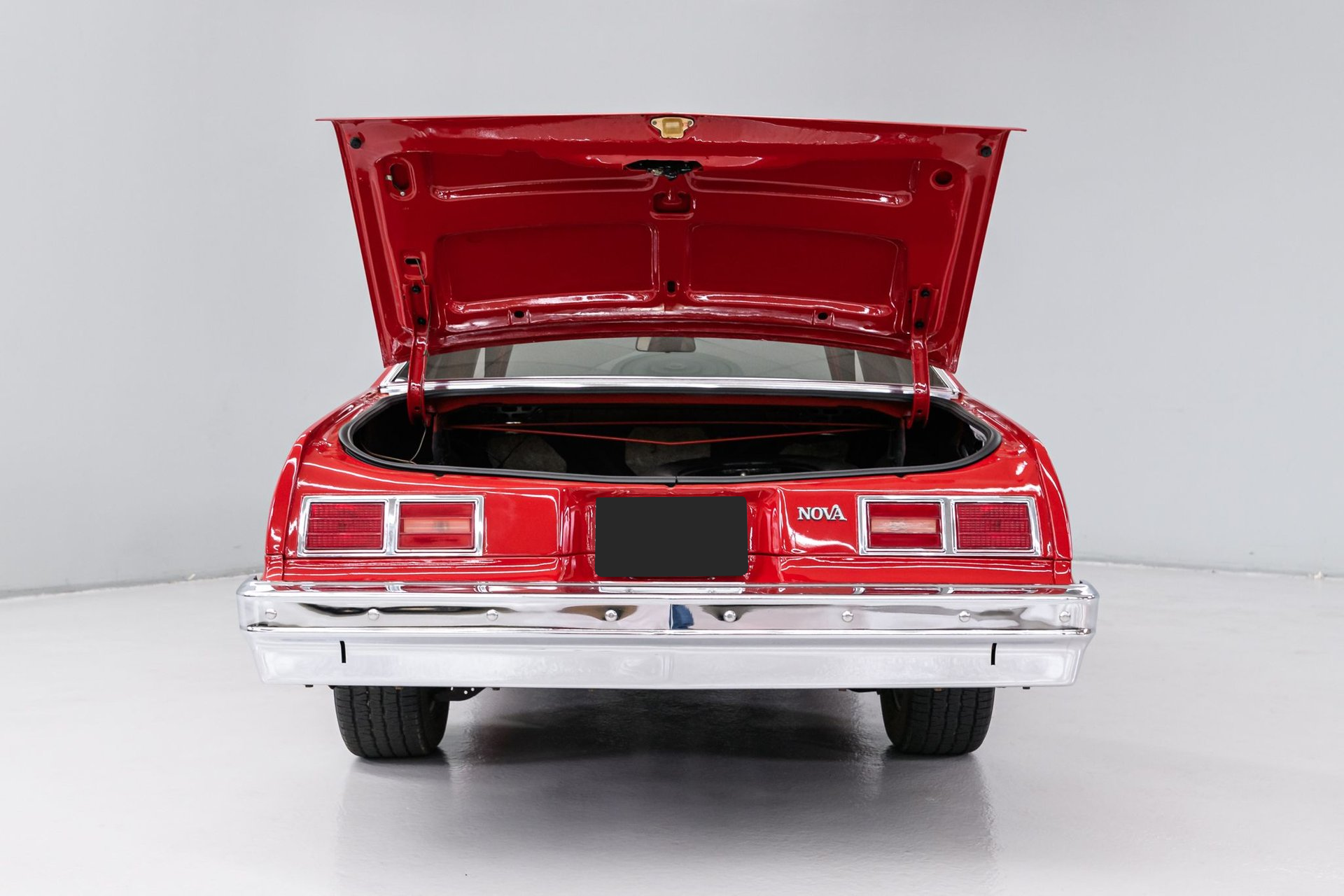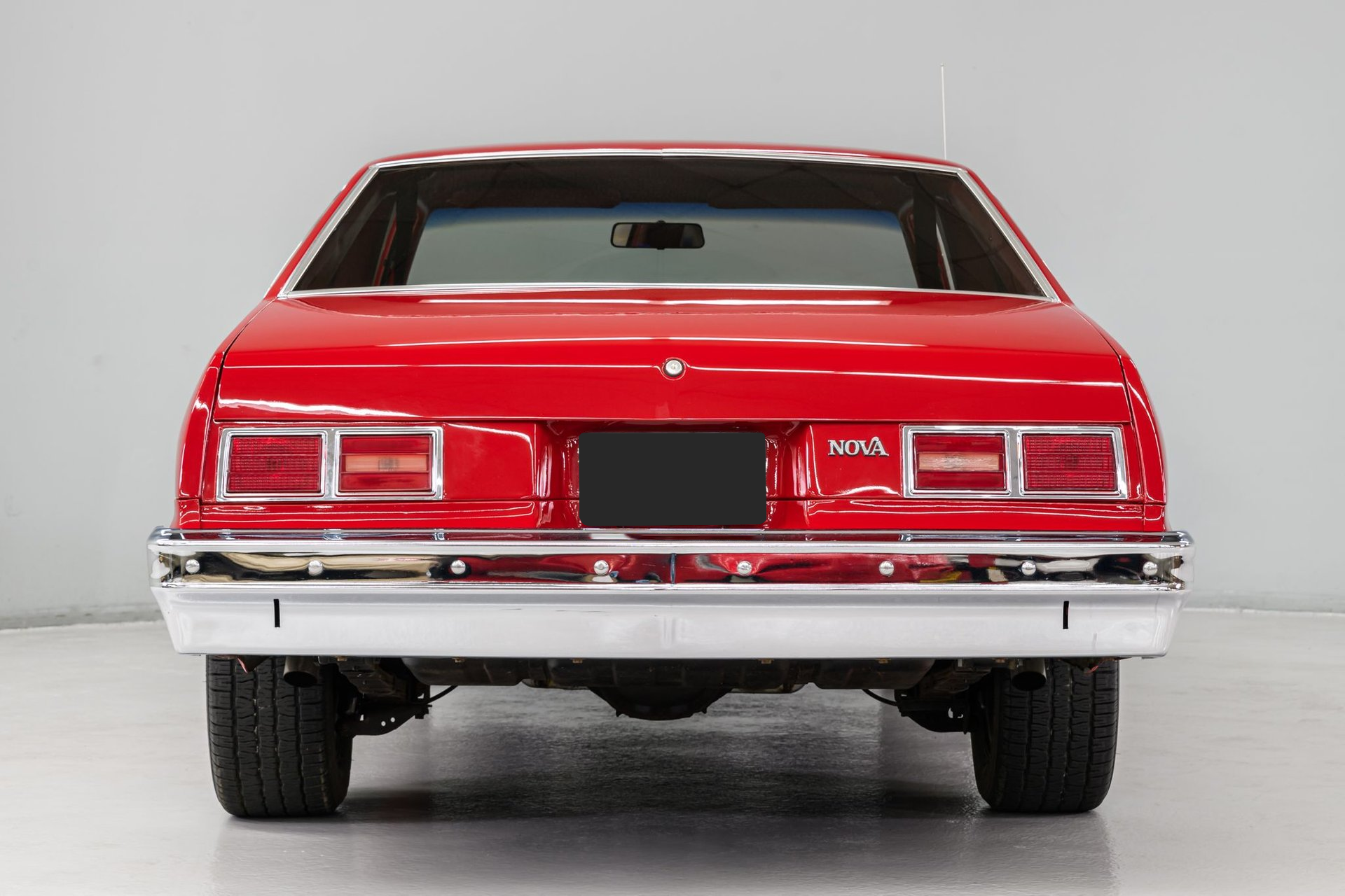 This 1976 Chevrolet Nova began life as a mundane 2-door post, but has been transformed into a performance coupe in the image of the Chevy Nova SS 350 muscle car of the late 60s. The Nova received a full restoration with mechanical upgrades (2018) and the owner states that the mileage shown (just under 58,000) is believed to be actual. The exterior was professionally refinished in 2-stage GM Torch Red and is in excellent condition. Chevy Rally wheels with trim rings/spinner centers mount 15” BFGoodrich Radial T/A tires and all chrome is excellent. The red cloth interior was carefully restored and is quite compelling. Dash, door cards, tinted windows, carpeting and headliner are all in excellent condition. A full set of SunPro gauges has been installed and an aftermarket AM/FM sound system furnishes tunes. That said, horsepower is the real story of this Nova. The original 305ci/2v (Q code) engine is long gone, replaced by a L98 350 Corvette motor that sounds awesome. It is equipped with aluminum heads, nice street cam, Edelbrock Performer EPS aluminum intake, Edelbrock 4V carburetor and stainless tube headers that exit to a free-flowing exhaust system. The motor sits in a spotless engine compartment with nice chrome accessories. Torque is delivered through a 350 TurboHydramatic 3-speed gearbox to a stout GM 10-bolt differential. The chassis is fitted with power steering, power disc/drum brakes w/dual master and front sway bar. This '76 Nova has been carefully restored and is truly a Chevrolet 'Perfect Sleeper'.