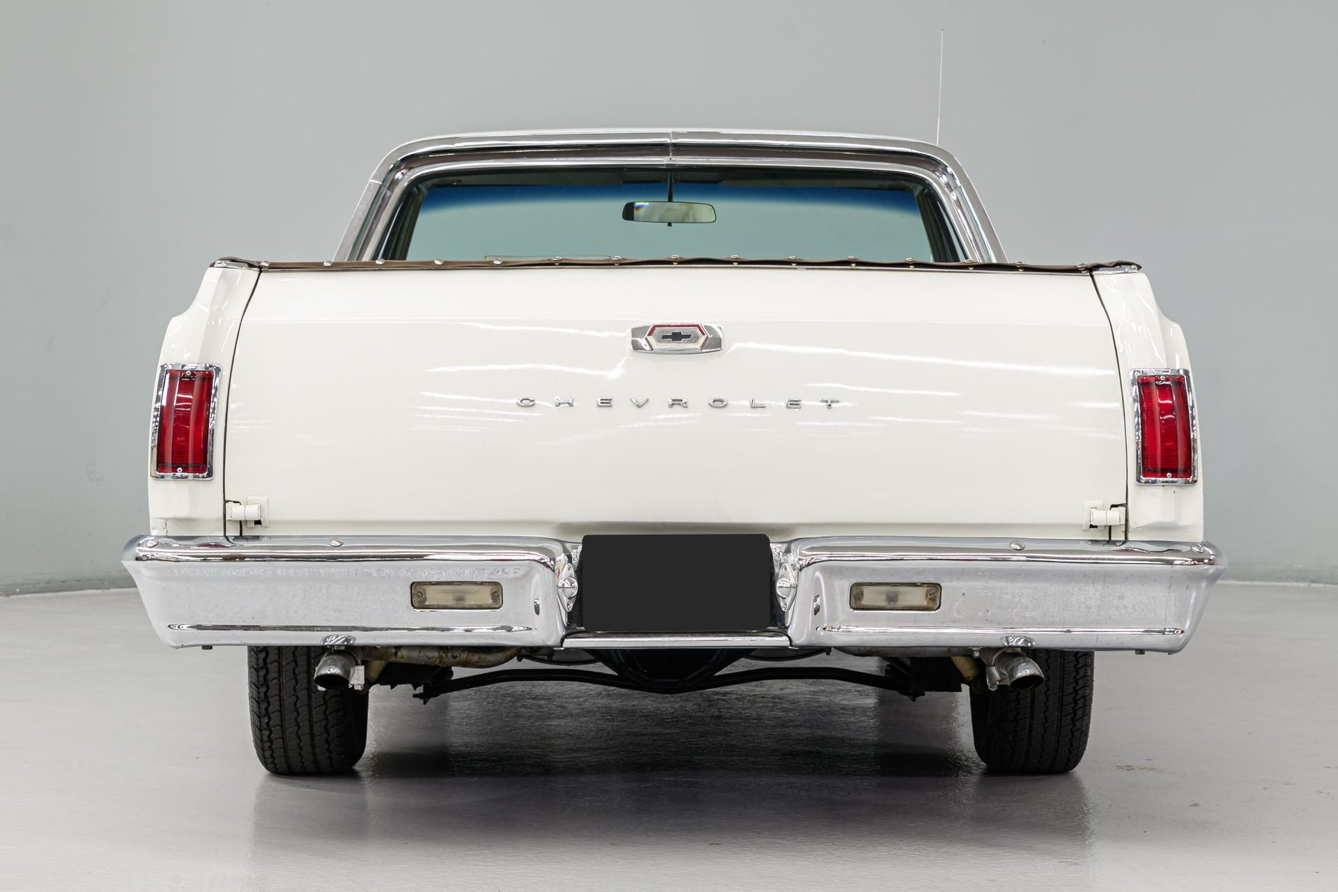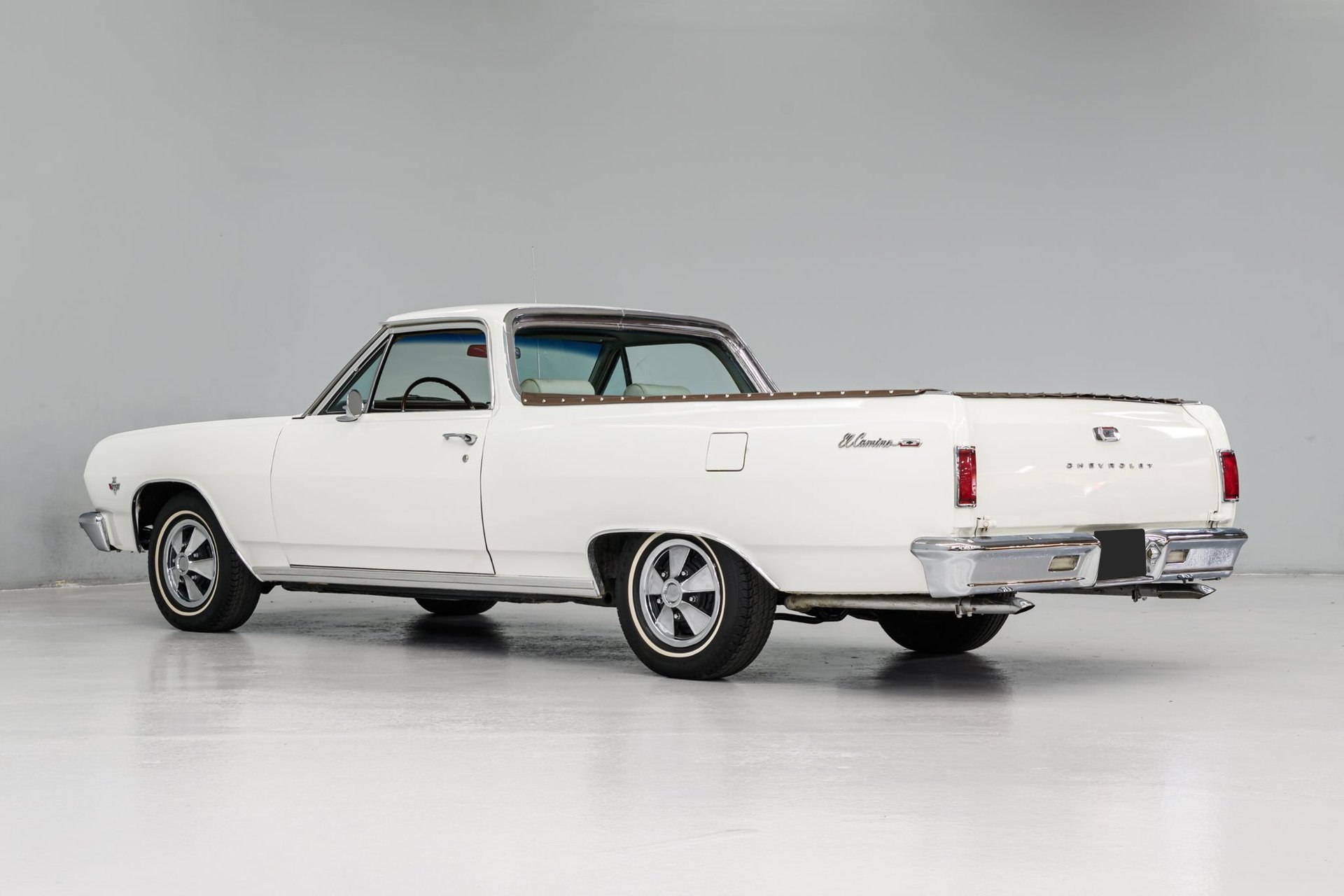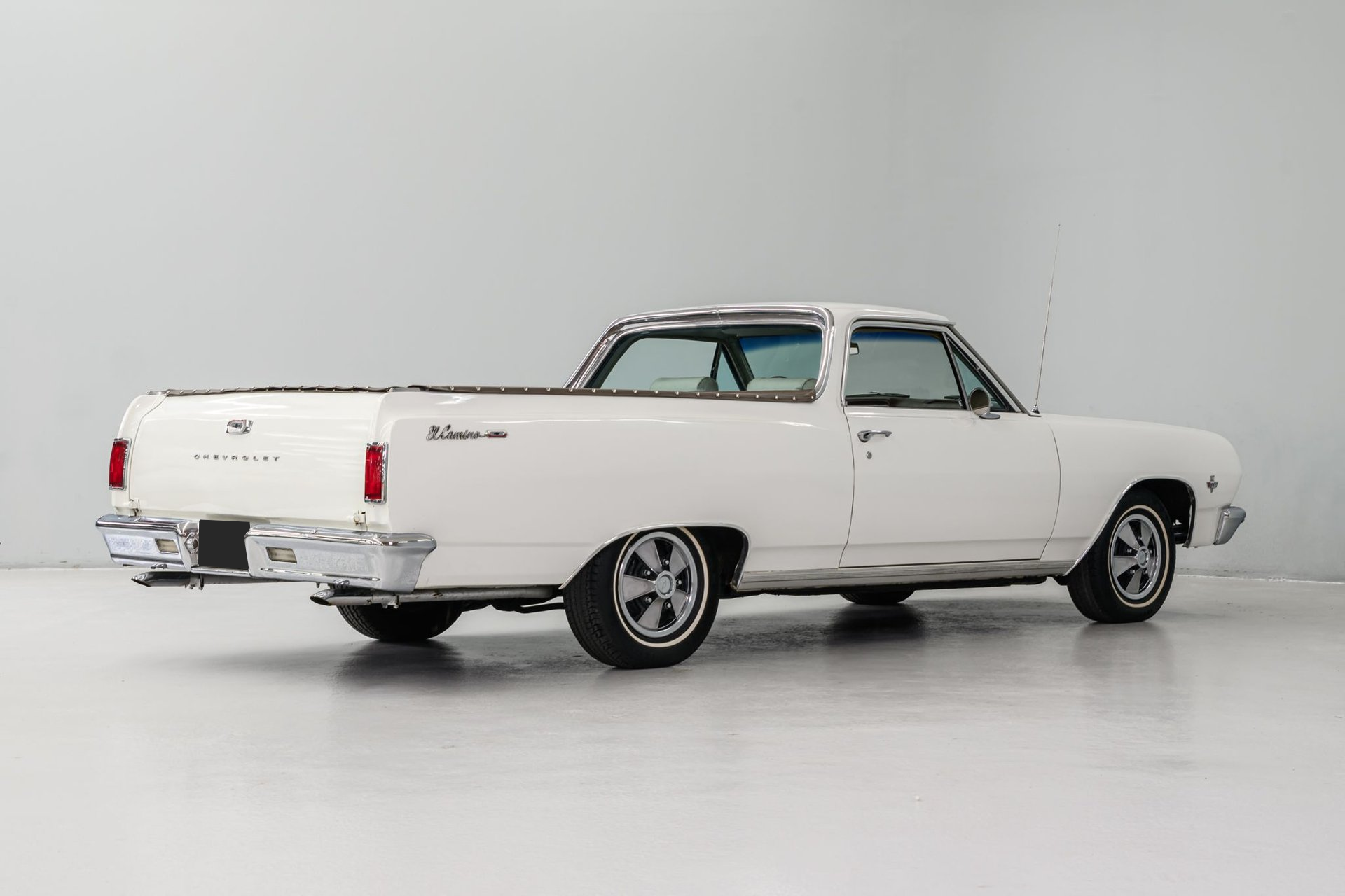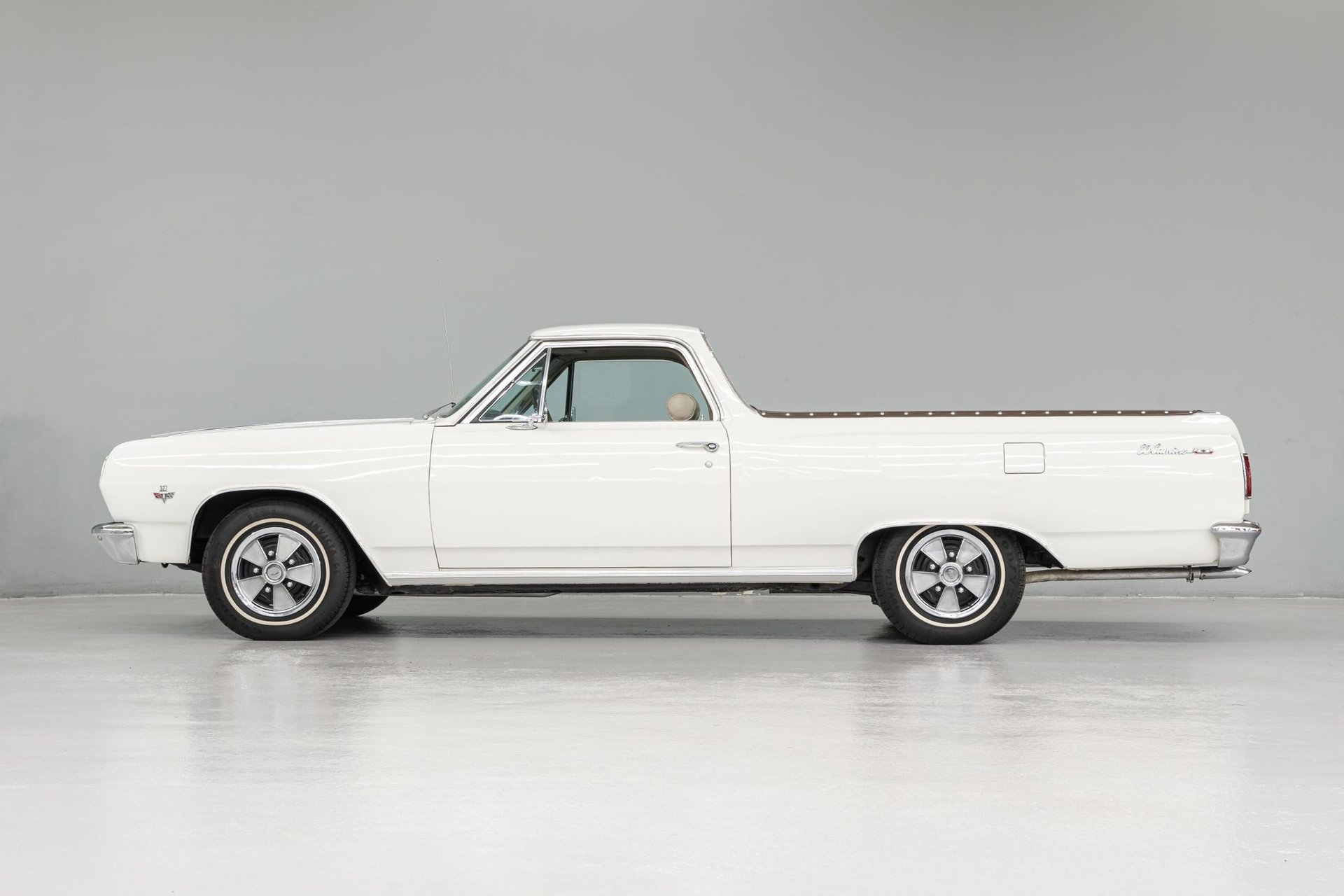 Chevrolet created their first 'hybrid' pickup in 1959 – the El Camino. The first generation was based on the full-size Chevrolet sedan chassis and was only built for two years. The second generation was reintroduced in 1964 and was based on the Chevelle platform. This '65 Chevy El Camino is mostly original except for a respray of original (C-code) Ermine White that is in very good condition. Chrome and stainless are excellent and a contrasting tan vinyl bed cover has been custom fitted. Factory steel wheels mount 14” Goodyear w/w radials with optional '65 Chevelle/El Camino 'mag' wheel covers. The handsome interior is in good original condition. Dash, door cards, headliner and carpeting are all nice. Comfort features include cold A/C, AM sound system, color-keyed mats, original wheel and tinted windows. Power is furnished by a 327ci small-block that is said to have never been rebuilt. It is equipped with a Carter AFB four-barrel carburetor and custom dual exhaust. Output for the base 327/4V engine was rated at 250hp. It is fitted with a new alternator and backed by a 2-speed PowerGlide automatic transmission that delivers torque to a 10-bolt differential. The chassis is fitted with power steering and manual 4-wheel drum brakes (new) w/dual master cylinder, rear air shock suspension and front sway bar. The current owner of this El Camino has taken excellent care of this classic Chevy and it is now ready for a new owner who will value this rare Bowtie 'hybrid' pickup.