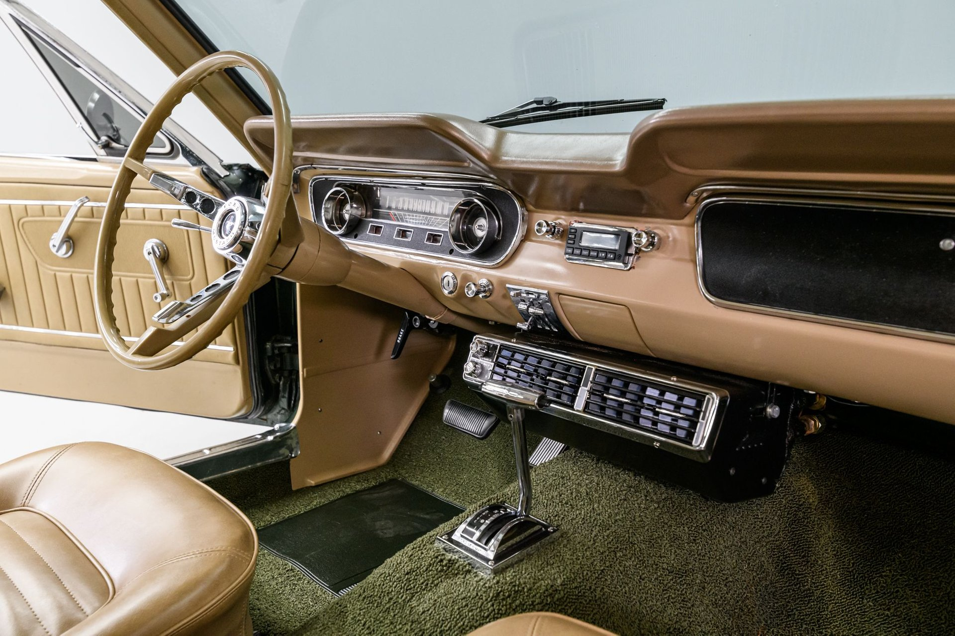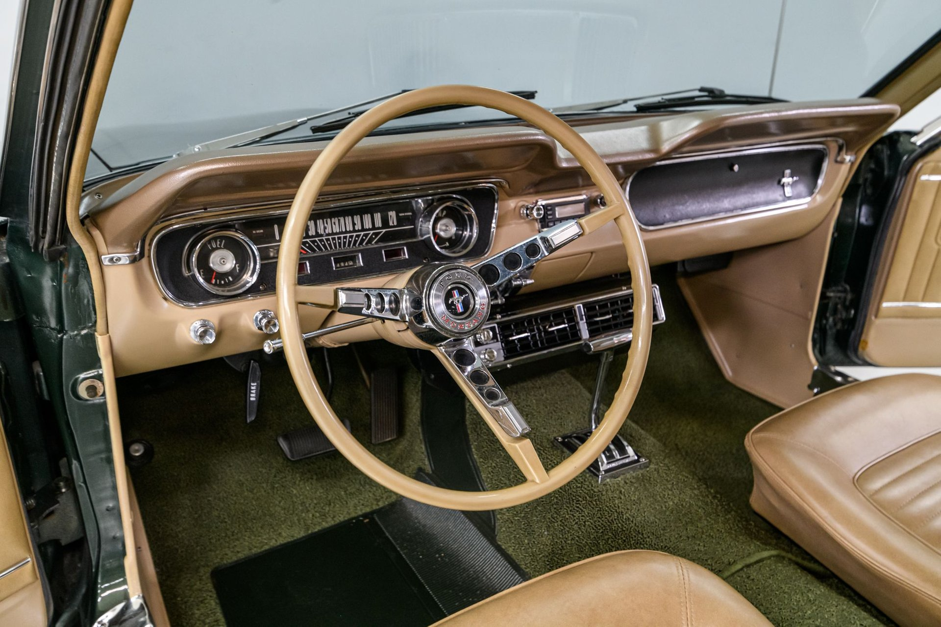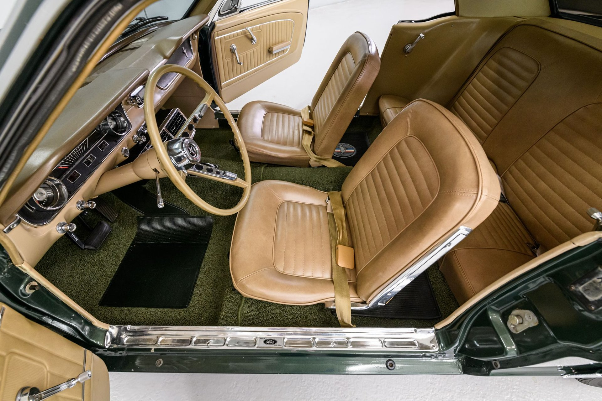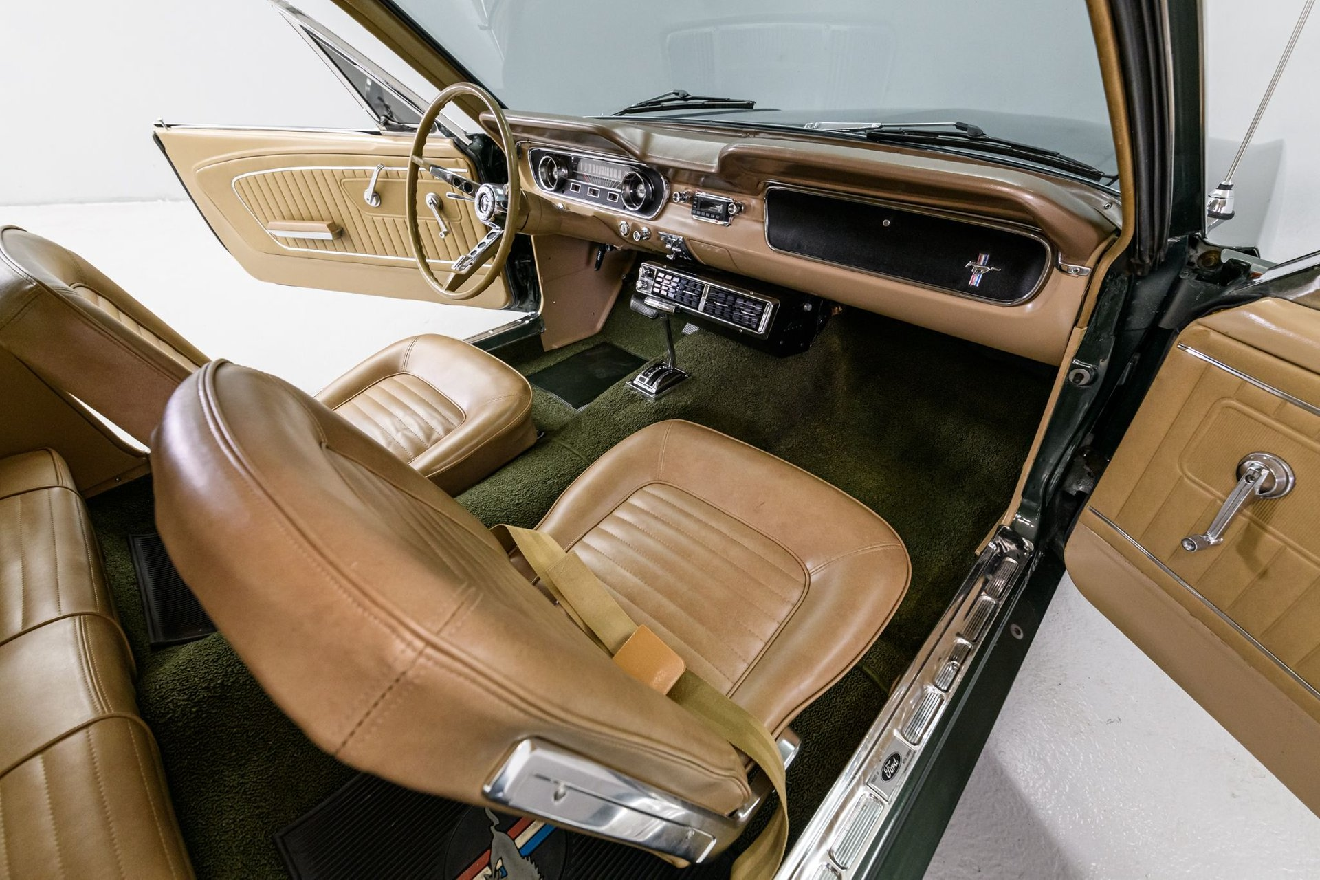 This 1965 Mustang coupe has been fully restored and is an outstanding example of one of the most popular Ford models ever built. A binder of receipts and photos is furnished that provides an extensive record of the restoration process. This Mustang coupe is said to have spent time in classic car museum after the restoration. The sound body was thoroughly evaluated and new metal panels were added where any damage was found. It was then carefully prepped and resprayed original Ivy Green (R-code), a professional 2-stage process that is in excellent condition. Chrome/stainless are in very good condition and factory 14” steel wheels w/full wheel covers mount nearly new UniRoyal Tiger Paw w/w radials. A custom cover is also provided for the car. The Palomino vinyl interior (code 29) has been fully restored and is virtually showroom. Upholstery, dash, carpeting, door cards and headliner are all excellent. The coupe is equipped with Vintage Air A/C, tinted windows and AM/FM sound system. The power train is Ford's bulletproof 'Mileage Maker' 200ci 'T-code' straight-six. It was rebuilt in 2008 and sits in a clean engine compartment. Power is delivered through a C4 3-speed Cruise-O-Matic transmission (6-code) to an open differential w/2.83:1 gearing. The spotless chassis is fitted with manual steering, 4-wheel power drum brakes w/dual master cylinder and new fuel tank. The exhaust system has also been upgraded to include dual outlet pipes. This beautifully restored, well cared for Mustang coupe will sell quickly.
