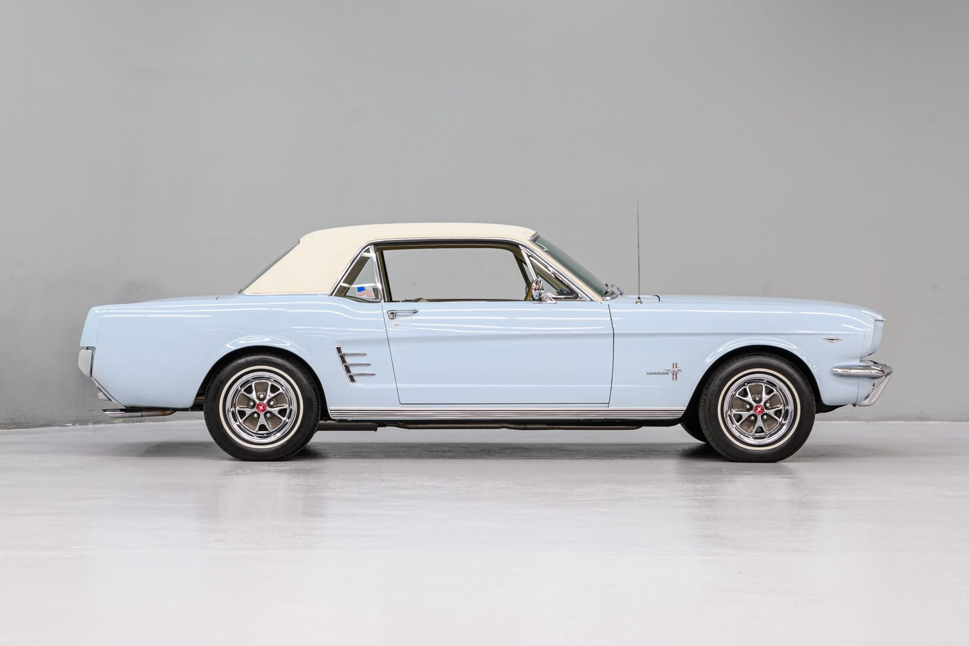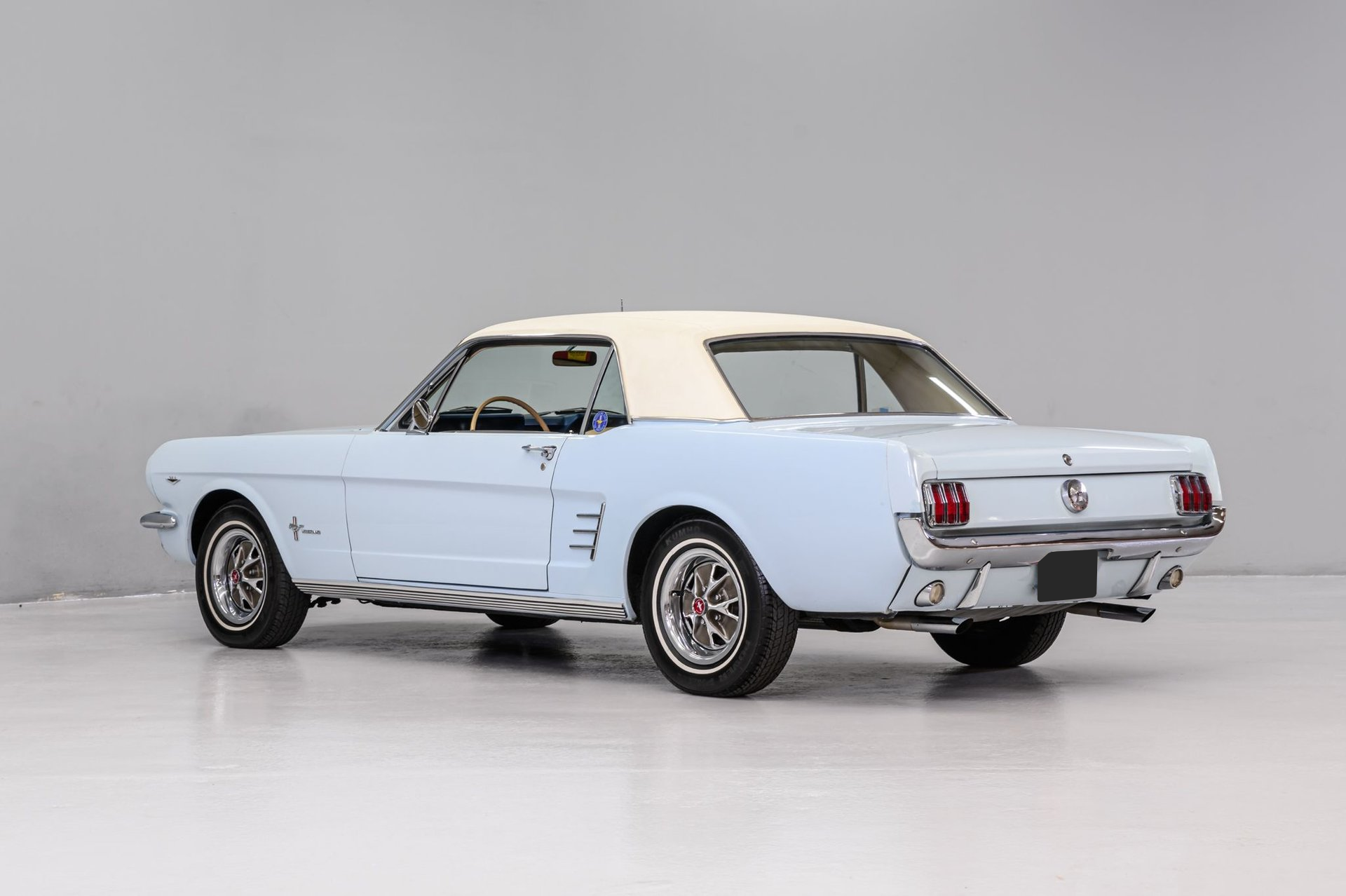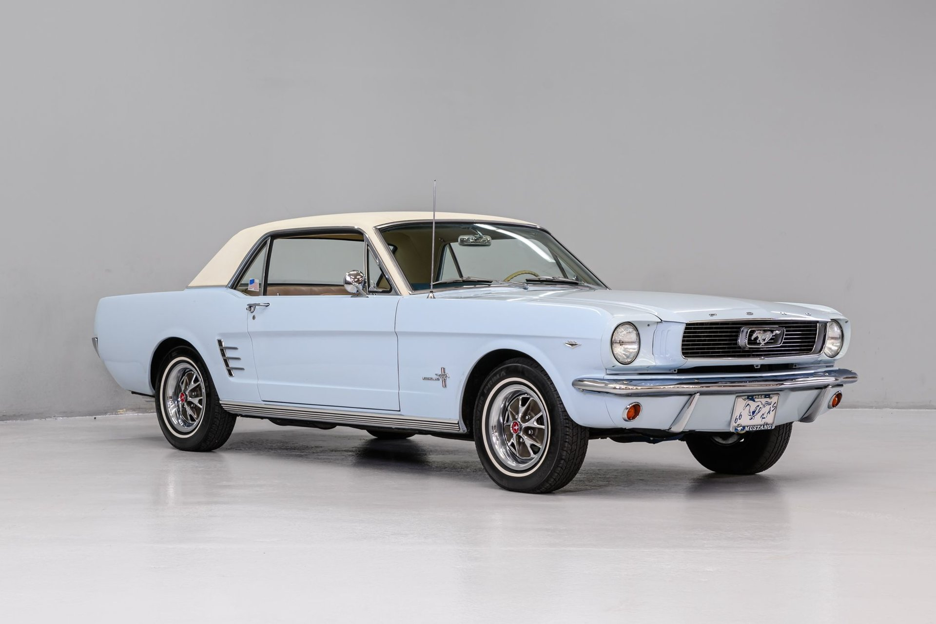 The first generation Mustang was manufactured from March 1964 until 1973 and created a new class of automobile known as the 'pony car'. This '66 Mustang coupe is a well-preserved original example (sans one respray) of this iconic brand. The owner stated that the mileage (87,000) is believed to be actual and that the 289ci/2v engine (C-code) is the factory motor and has not been rebuilt. The Windsor engine currently incorporates an electronic ignition and has been recently serviced with new plugs, distributor cap, wires, belts and hoses. Torque is delivered via a C4 3-speed automatic gearbox to a stock differential and it sounds strong though a dual exhaust setup. The solid body was professionally reshot in original Arcadian Blue Silver Blue finish (F-code). A Parchment Crinkle vinyl top is in very good condition as is all chrome/stainless trim. Factory Mustang GT wheels mount Kuhmo Power Prima white-wall radial tires. The Mustang's original Rosette Beige interior is in very good condition. There is a complete set of factory gauges, a classic 3-spoke wheel and an AM sound system for your tunes. A new windshield and front/back window seals have been installed along with a new headliner/visors. The solid chassis has been upgraded with front disc brakes (rear drum), dual master cylinder and stainless lines. If you want a fun, classic Blue Oval, this sharp Mustang coupe has your name on it.