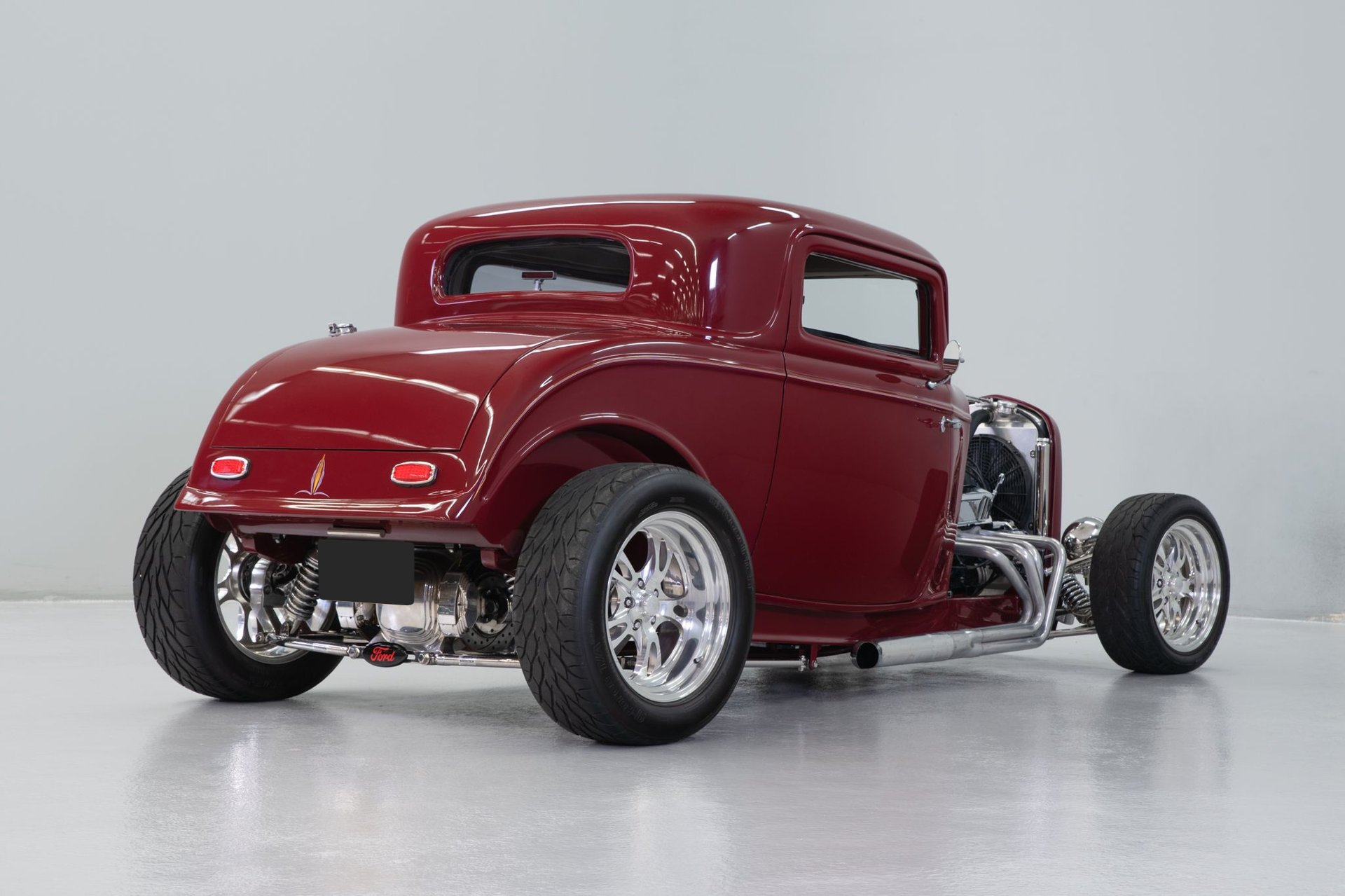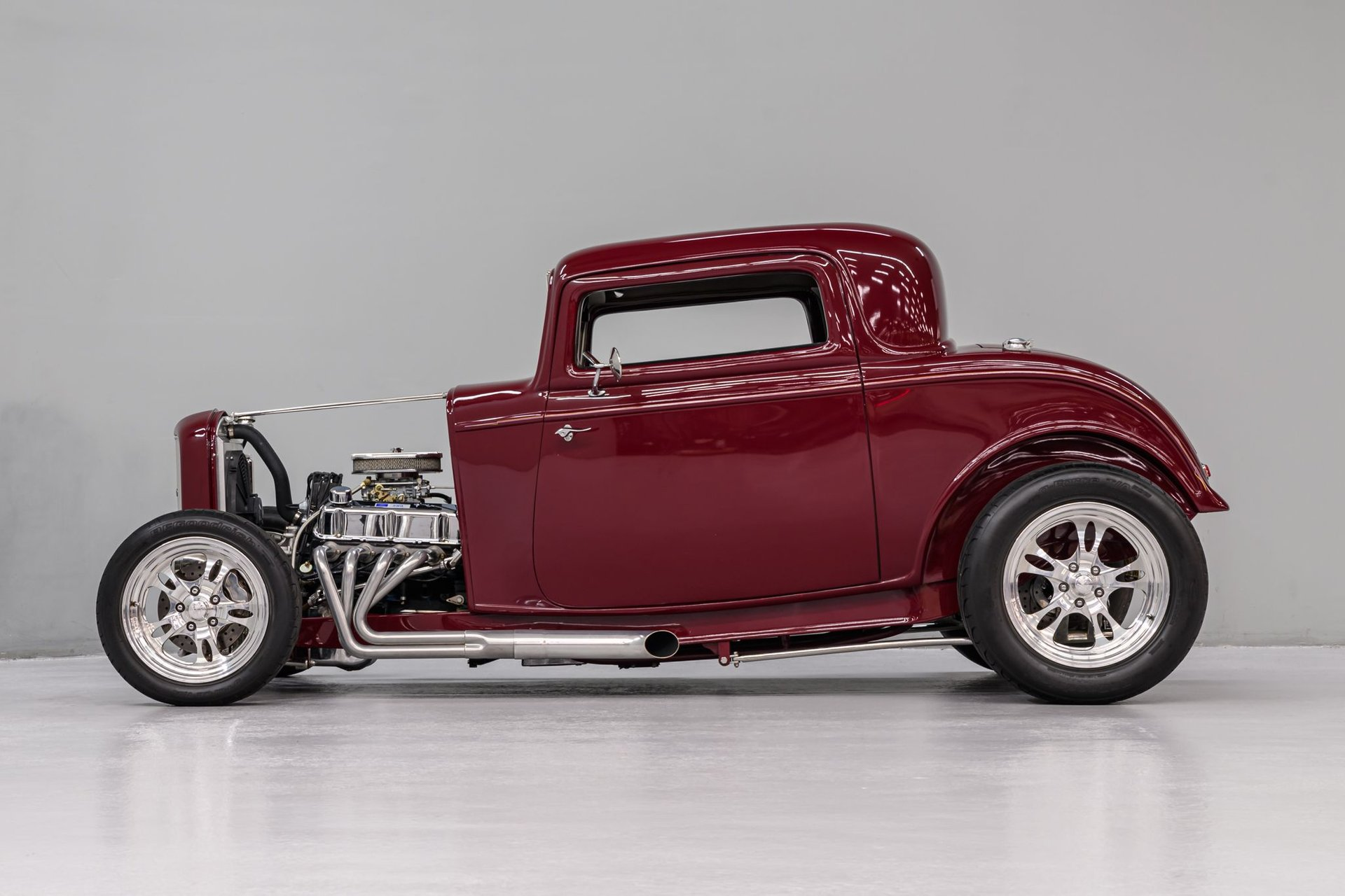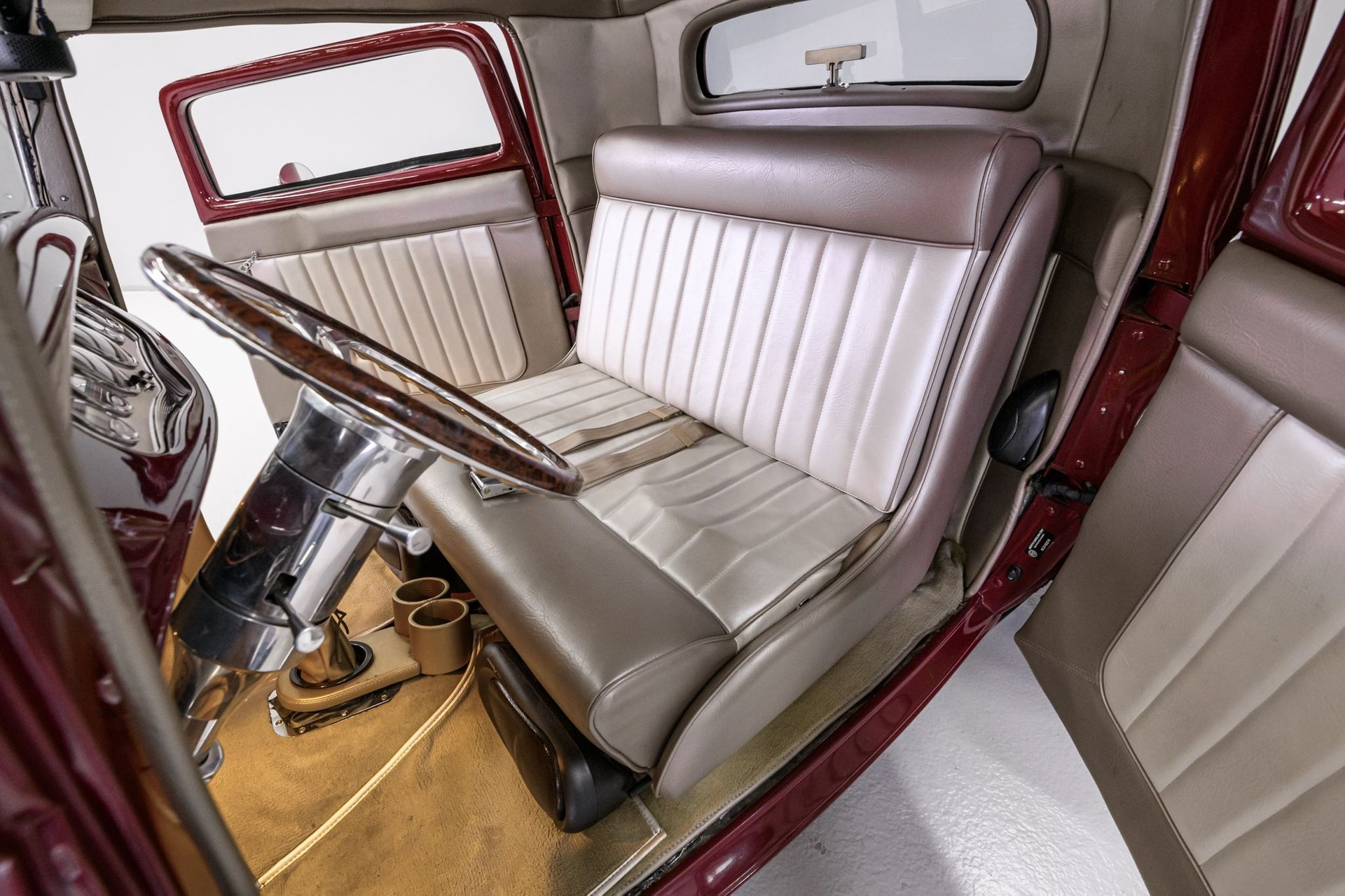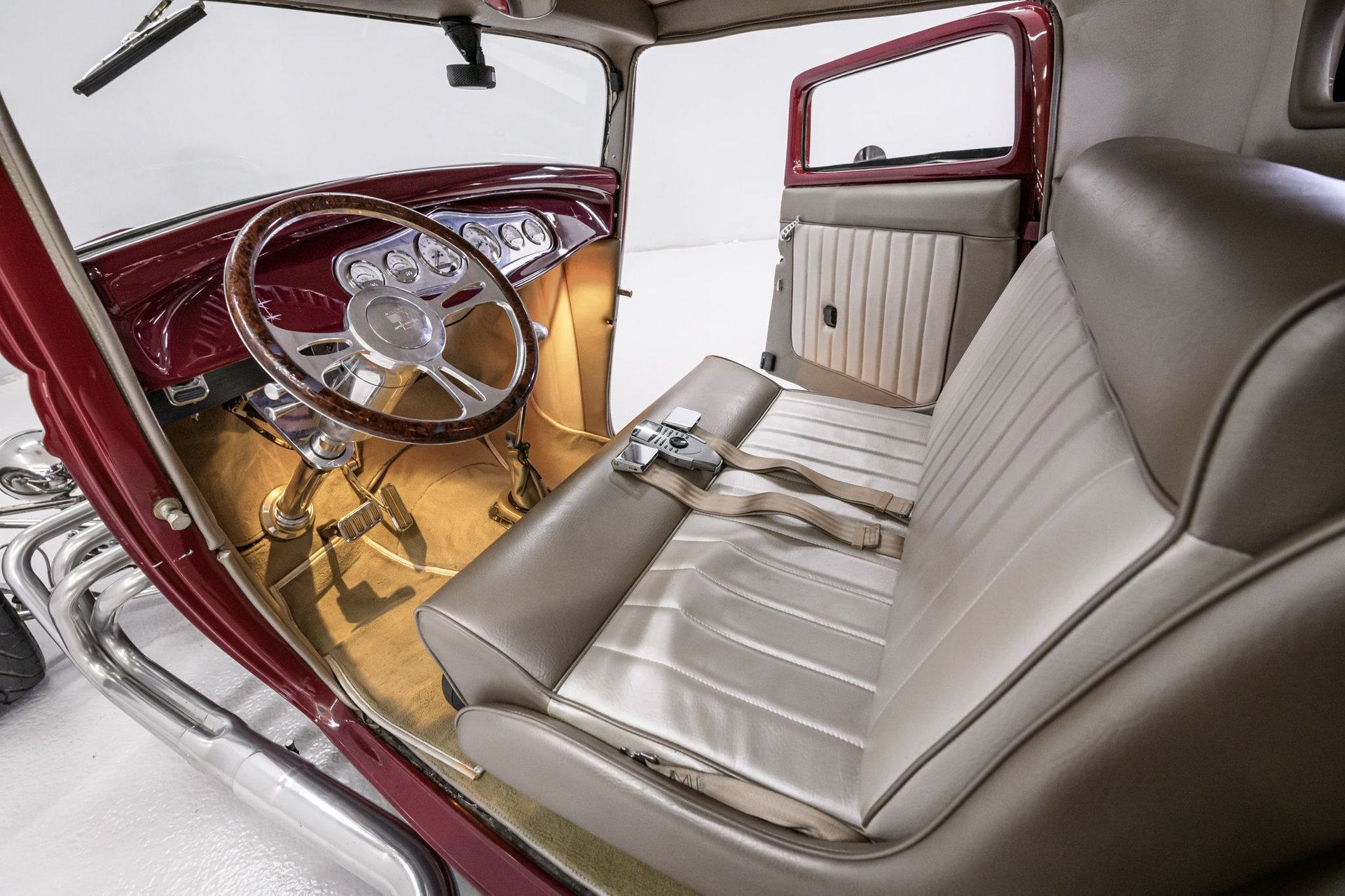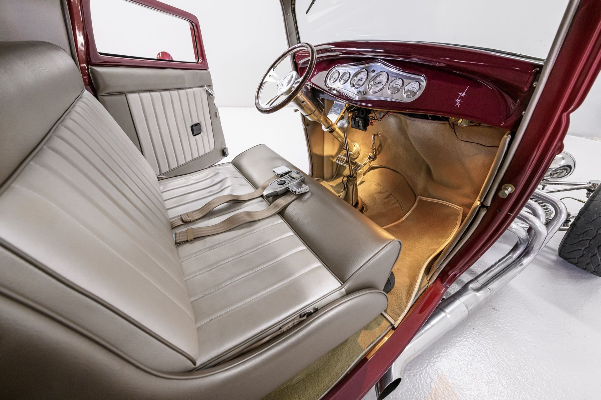 If you plan to build a top-shelf street rod, you must begin with a vision. You must then execute every detail carefully with the best components available. When done correctly, the result will be in a class with this 1932 Ford 'Deuce Coupe'. The Model B 'replica' utilizes a 3-window fiberglass body, Ford/Heidts drivetrain and custom Heidts suspension. The professional Burgundy finish is exceptional and fits the build perfectly. There is no hood, no engine side covers, no fenders and a pair of suicide doors – pure. The Billet Specialty alloys (16”f/18”r) mount BFGoodrich G-Force T/A radials and a pair of low, shock-mount headlight assemblies flank the deuce grill. The interior is upholstered in 2-tone tan vinyl with matching door cards and headliner - it is stunning. The classic dash contains a polished insert and full set of AutoMeter white-faced gauges. A Billet Specialties alloy/wood-accented wheel is mounted on an tilt column and tunes are provided by a SecretAudio AM/FM sound system w/Bluetooth/remote that is tucked carefully under the seat. Other convenience features include power windows, power trunk and a Dash Cam. A Ron Francis wiring harness takes the guesswork out of the electrics. Horsepower is furnished by a high-performance Ford 289ci crate motor that is fitted with an Edelbrock intake and Holley 4V carburetor. Tube headers and side pipes are ceramic coated and an aluminum radiator w/electric fan manages cooling. Behind this 'Windsor' sits a Ford C-4 automatic transmission w/Lokar shifter. The painted/detailed chassis is fitted with Heidts suspension components front and rear. A power rack/pinion steering system is integrated into the front coil-over suspension package and the polished independent rear suspension is a multi-link design w/radius rods, half-shafts and coil-overs. The posi-traction differential is fitted with street gearing and power assisted 4-wheel disc brakes provide stopping power. Receipts of the build are included in the sale. This classic 'Little Deuce Coupe' will become a centerpiece in your Blue Oval garage.