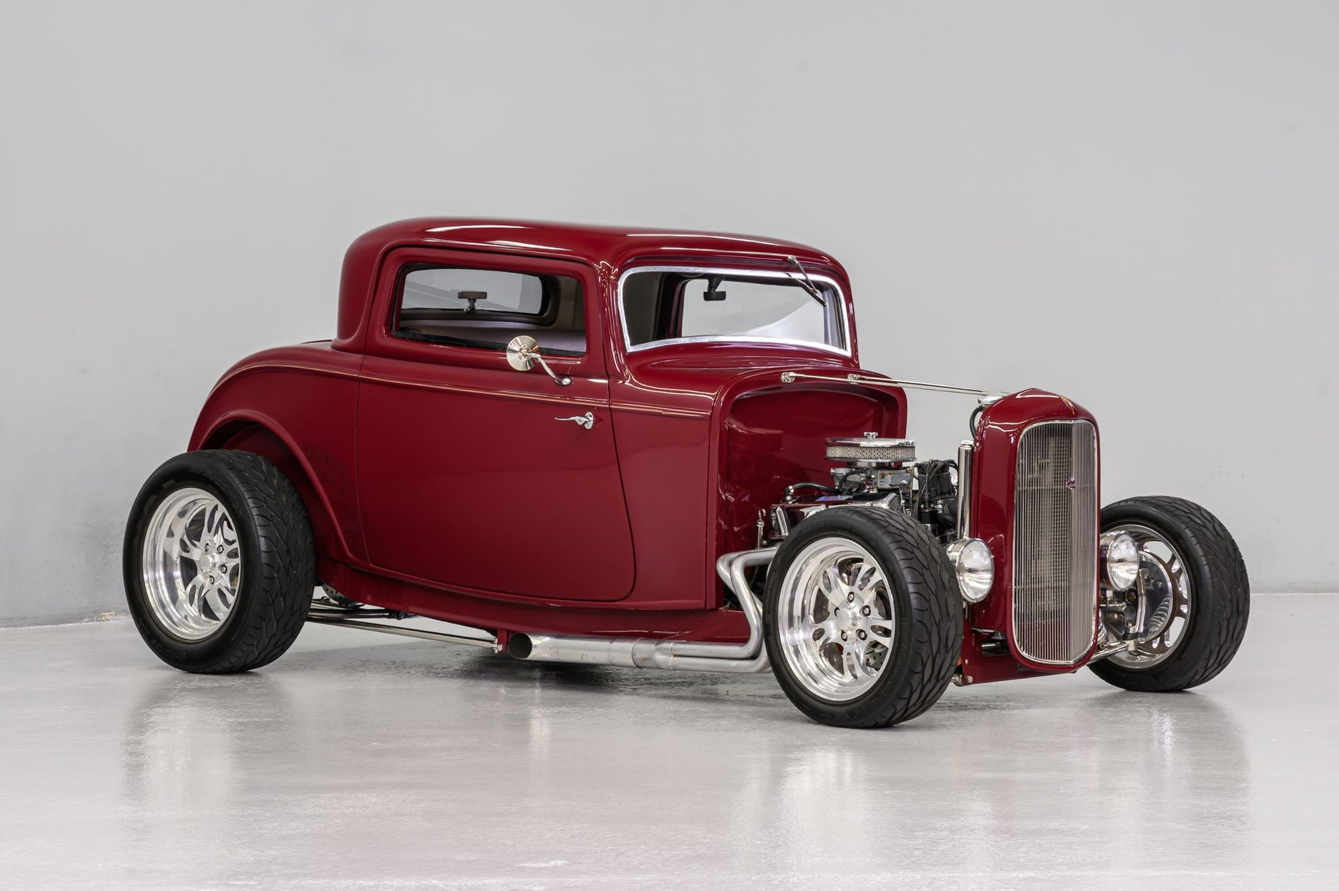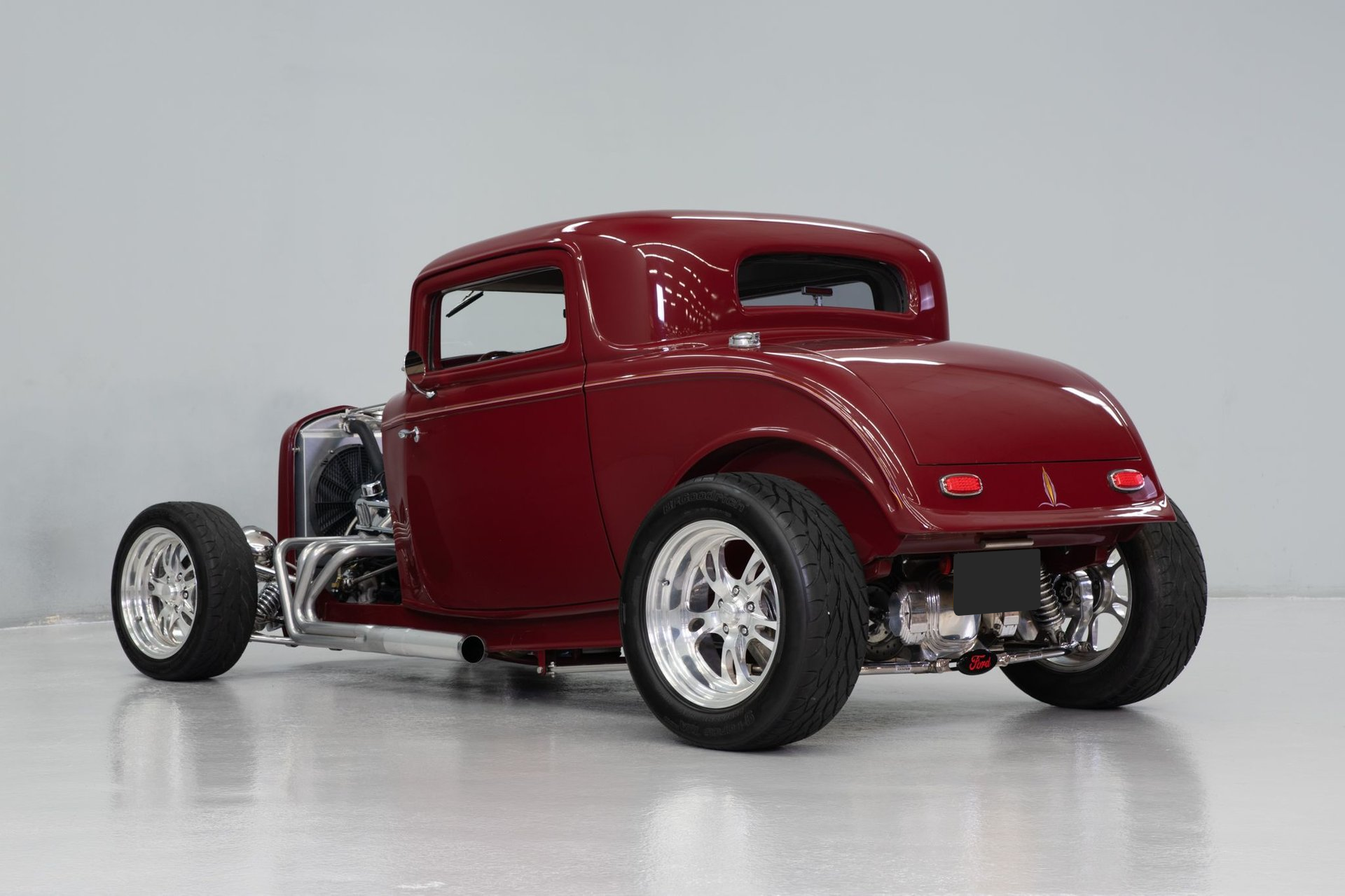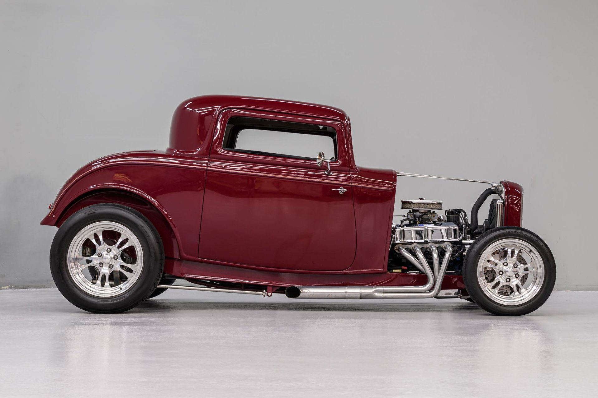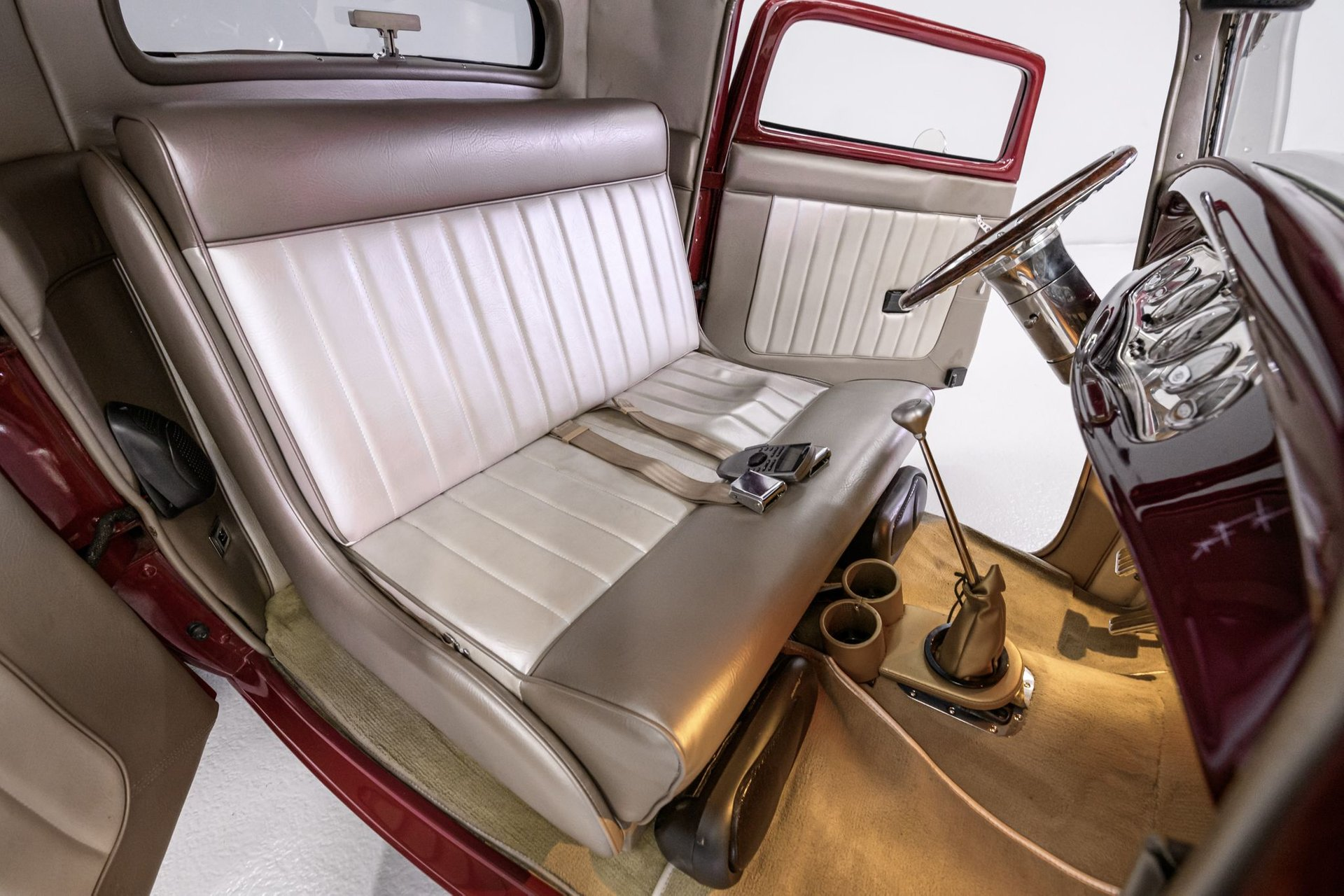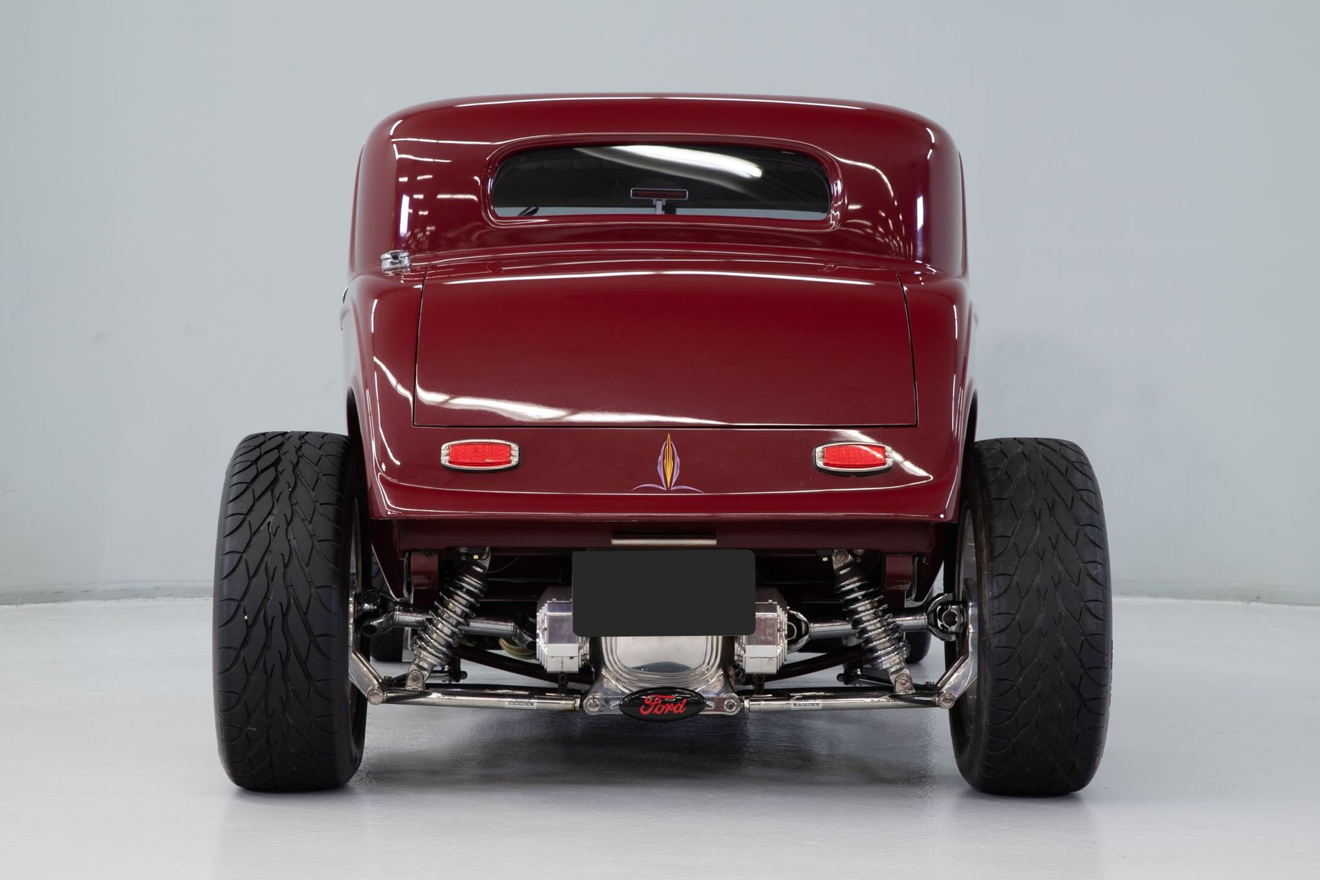 If you plan to build a top-shelf street rod, you must begin with a vision. You must then execute every detail carefully with the best components available. When done correctly, the result will be in a class with this 1932 Ford 'Deuce Coupe'. The Model B 'replica' utilizes a 3-window fiberglass body, Ford/Heidts drivetrain and custom Heidts suspension. The professional Burgundy finish is exceptional and fits the build perfectly. There is no hood, no engine side covers, no fenders and a pair of suicide doors – pure. The Billet Specialty alloys (16”f/18”r) mount BFGoodrich G-Force T/A radials and a pair of low, shock-mount headlight assemblies flank the deuce grill. The interior is upholstered in 2-tone tan vinyl with matching door cards and headliner - it is stunning. The classic dash contains a polished insert and full set of AutoMeter white-faced gauges. A Billet Specialties alloy/wood-accented wheel is mounted on an tilt column and tunes are provided by a SecretAudio AM/FM sound system w/Bluetooth/remote that is tucked carefully under the seat. Other convenience features include power windows, power trunk and a Dash Cam. A Ron Francis wiring harness takes the guesswork out of the electrics. Horsepower is furnished by a high-performance Ford 289ci crate motor that is fitted with an Edelbrock intake and Holley 4V carburetor. Tube headers and side pipes are ceramic coated and an aluminum radiator w/electric fan manages cooling. Behind this 'Windsor' sits a Ford C-4 automatic transmission w/Lokar shifter. The painted/detailed chassis is fitted with Heidts suspension components front and rear. A power rack/pinion steering system is integrated into the front coil-over suspension package and the polished independent rear suspension is a multi-link design w/radius rods, half-shafts and coil-overs. The posi-traction differential is fitted with street gearing and power assisted 4-wheel disc brakes provide stopping power. Receipts of the build are included in the sale. This classic 'Little Deuce Coupe' will become a centerpiece in your Blue Oval garage.