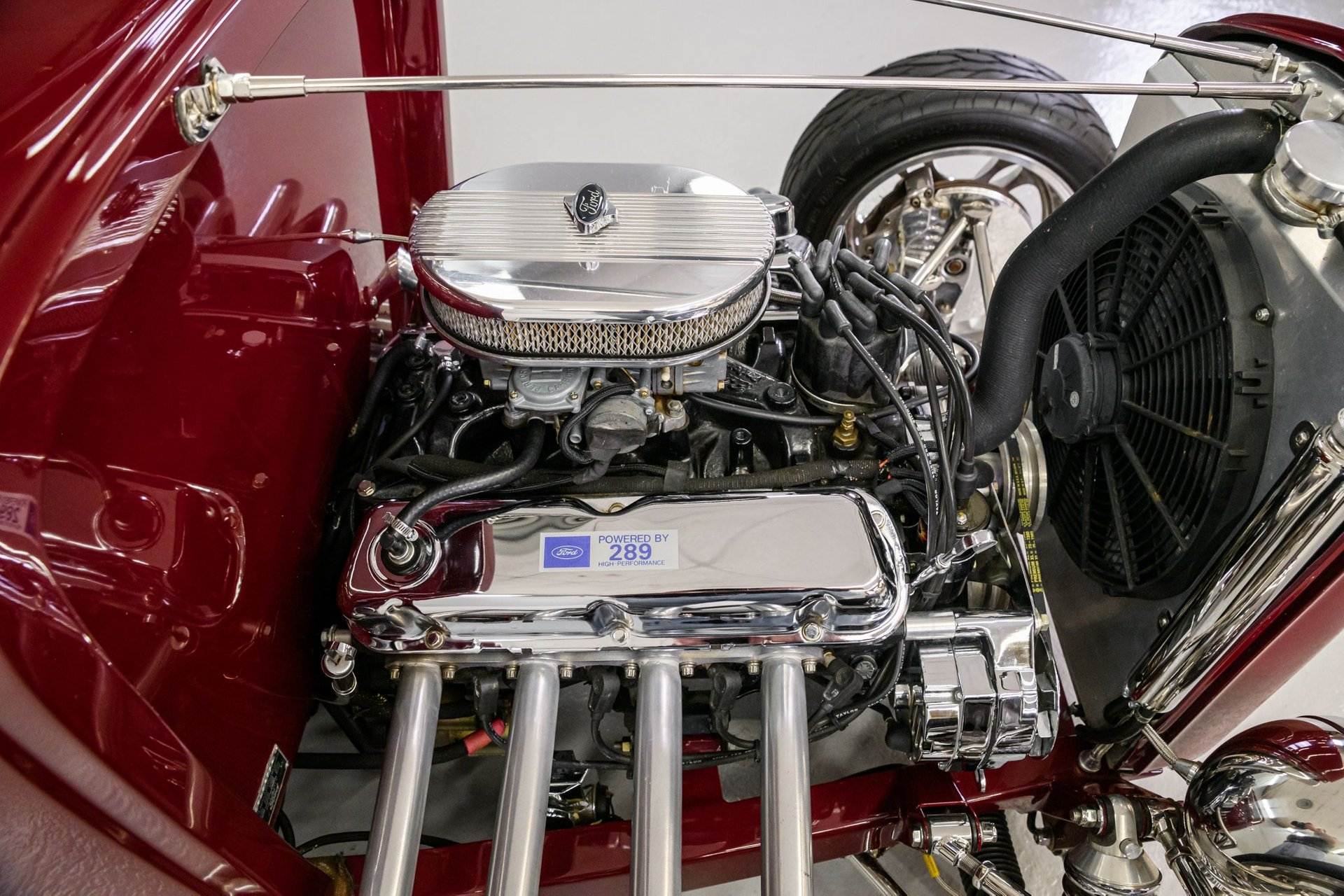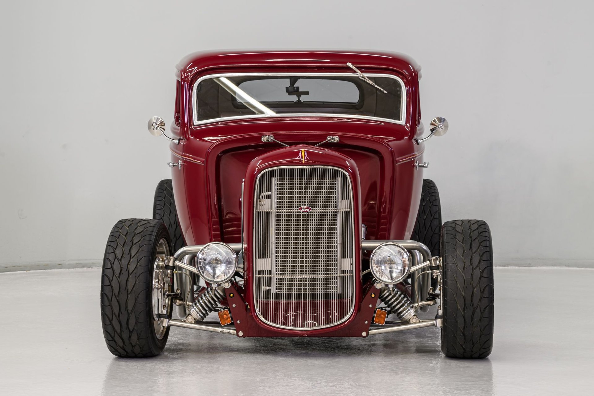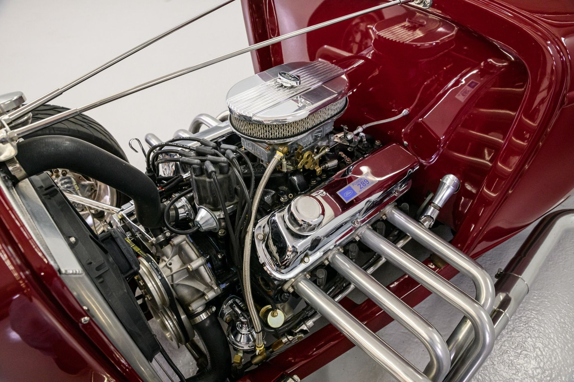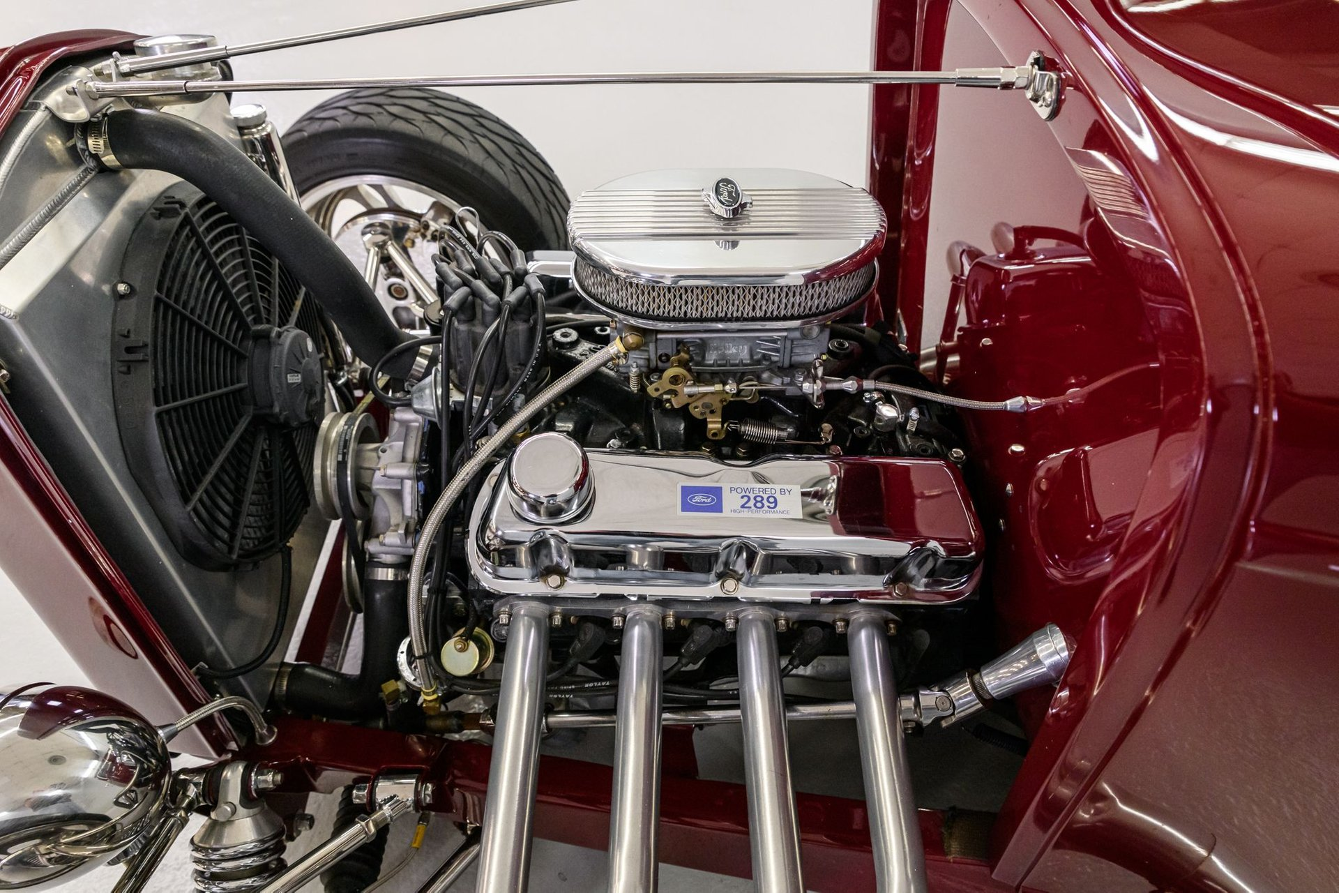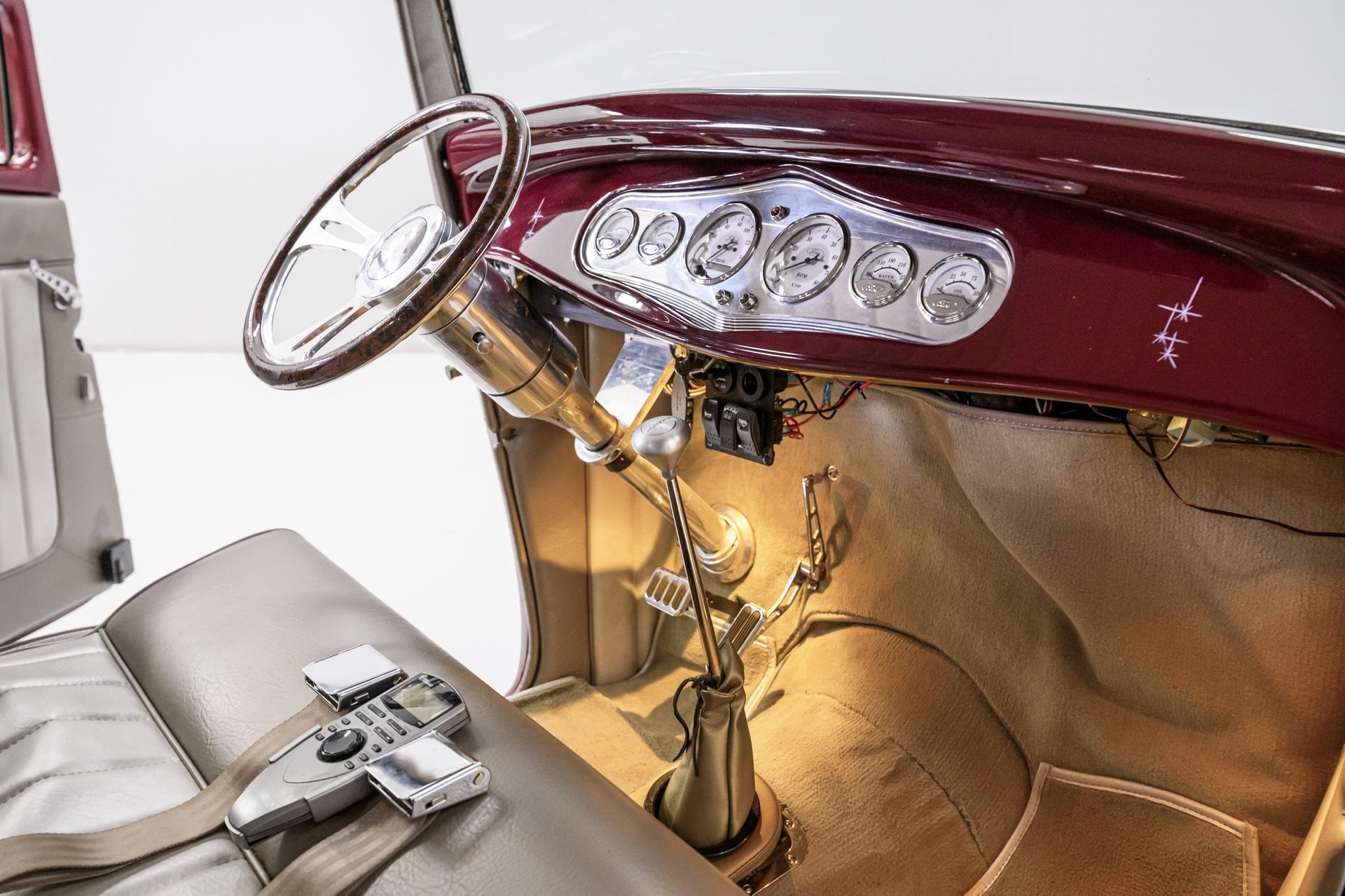 If you plan to build a top-shelf street rod, you must begin with a vision. You must then execute every detail carefully with the best components available. When done correctly, the result will be in a class with this 1932 Ford 'Deuce Coupe'. The Model B 'replica' utilizes a 3-window fiberglass body, Ford/Heidts drivetrain and custom Heidts suspension. The professional Burgundy finish is exceptional and fits the build perfectly. There is no hood, no engine side covers, no fenders and a pair of suicide doors – pure. The Billet Specialty alloys (16”f/18”r) mount BFGoodrich G-Force T/A radials and a pair of low, shock-mount headlight assemblies flank the deuce grill. The interior is upholstered in 2-tone tan vinyl with matching door cards and headliner - it is stunning. The classic dash contains a polished insert and full set of AutoMeter white-faced gauges. A Billet Specialties alloy/wood-accented wheel is mounted on an tilt column and tunes are provided by a SecretAudio AM/FM sound system w/Bluetooth/remote that is tucked carefully under the seat. Other convenience features include power windows, power trunk and a Dash Cam. A Ron Francis wiring harness takes the guesswork out of the electrics. Horsepower is furnished by a high-performance Ford 289ci crate motor that is fitted with an Edelbrock intake and Holley 4V carburetor. Tube headers and side pipes are ceramic coated and an aluminum radiator w/electric fan manages cooling. Behind this 'Windsor' sits a Ford C-4 automatic transmission w/Lokar shifter. The painted/detailed chassis is fitted with Heidts suspension components front and rear. A power rack/pinion steering system is integrated into the front coil-over suspension package and the polished independent rear suspension is a multi-link design w/radius rods, half-shafts and coil-overs. The posi-traction differential is fitted with street gearing and power assisted 4-wheel disc brakes provide stopping power. Receipts of the build are included in the sale. This classic 'Little Deuce Coupe' will become a centerpiece in your Blue Oval garage.