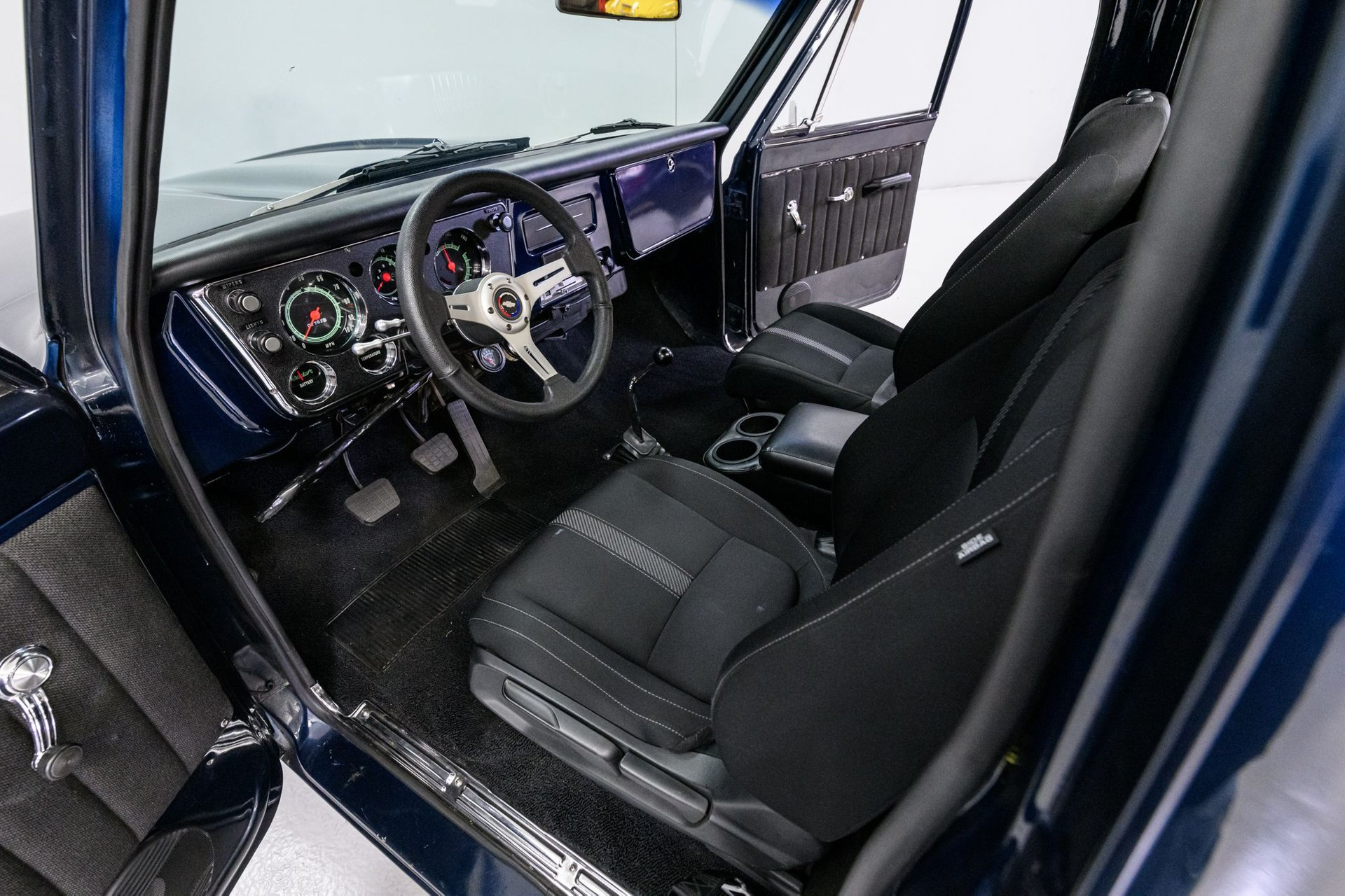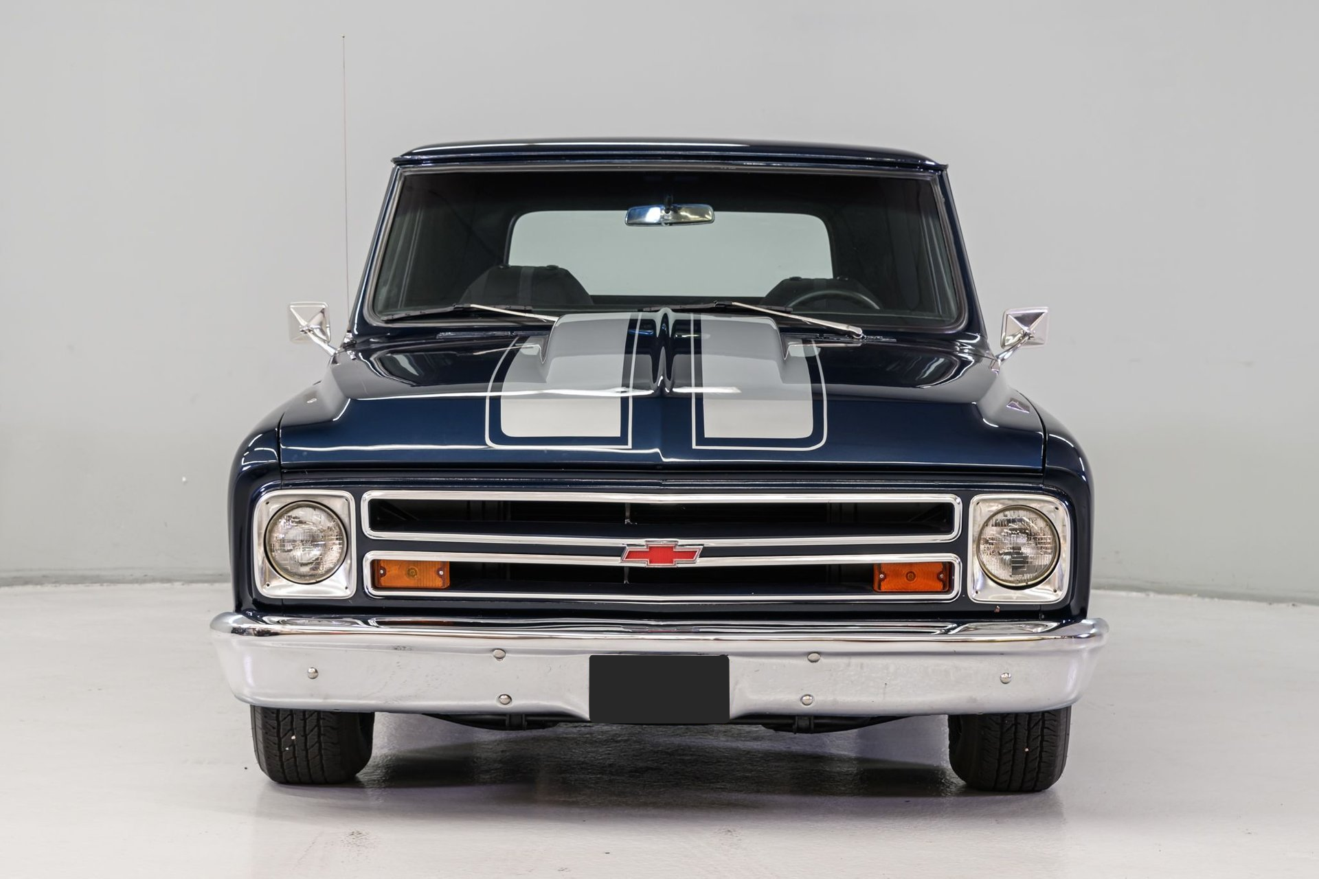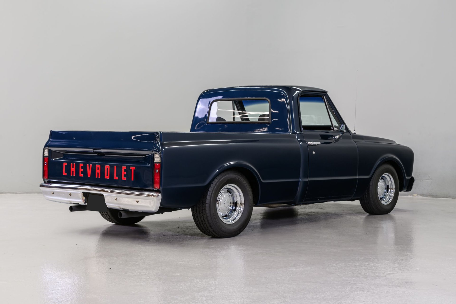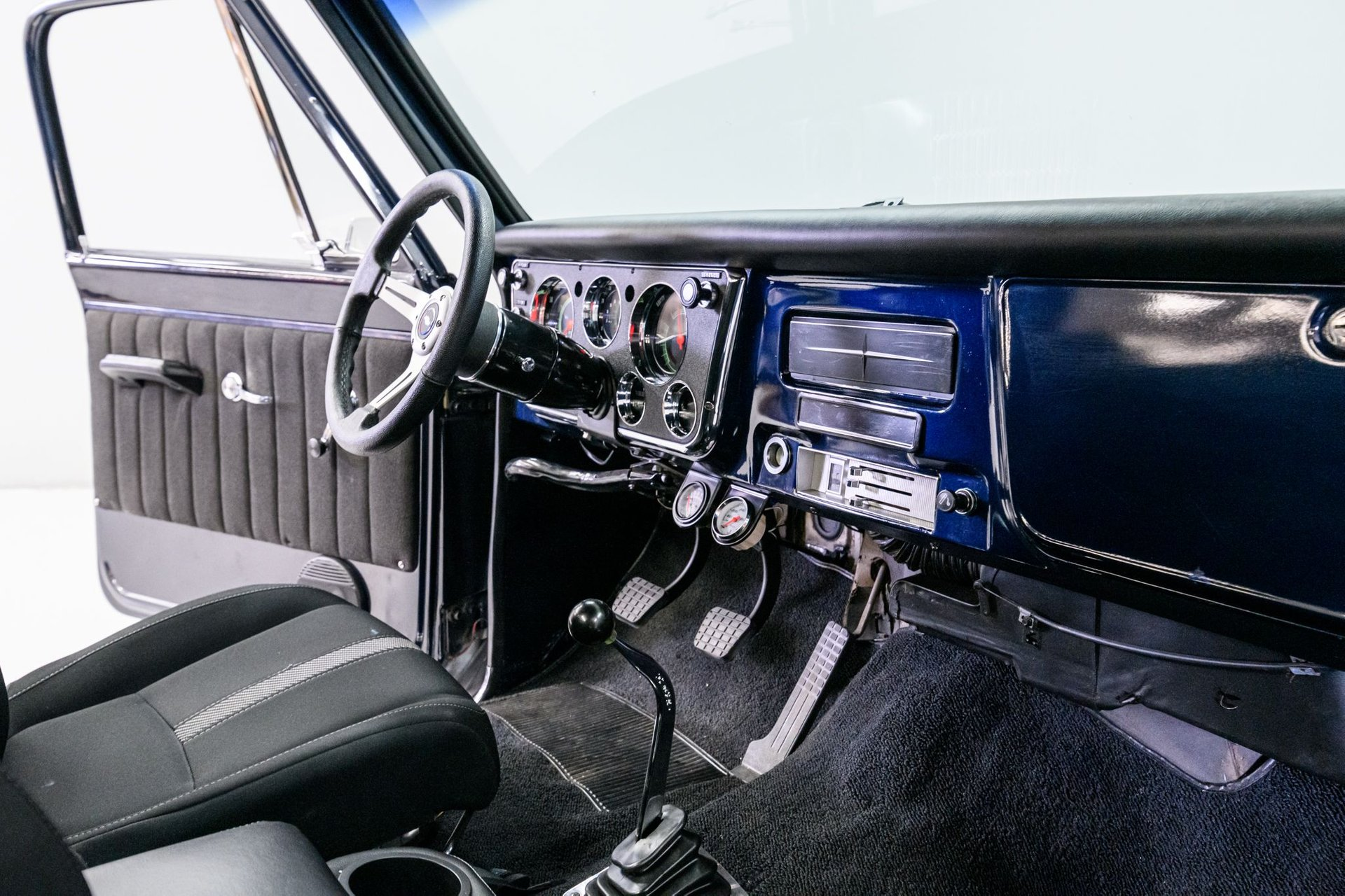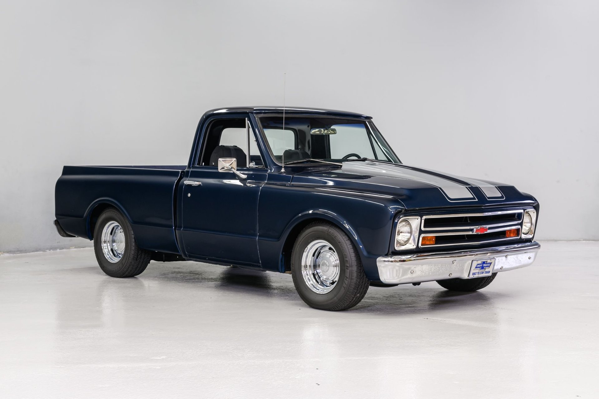 Chevrolet referred to the 1967 C-10 pickup as the 'WorkPower' truck. Most were equipped with a 250ci straight six - the big-block Chevy V8 motors were reserved for Impalas, Chevelles and Corvettes. After a total restoration, this 1967 C-10 'Styleside' short-bed, now powered by a 408ci 'Rat”, is a far cry from that six-cylinder model. The straight exterior has been professionally reshot in Nissan Dark Blue - a stunning 2-stage finish w/Z28 hood stripes. A cowl-induction hood has been installed and all chrome/stainless components are excellent. The suspension has been slightly lowered all around and a set of 15” chromed Chevy rally wheels w/center caps mount Cooper performance radial tires. Beautiful cedar wood boards and treated plywood have been installed over the original steel floor of the Rhino-lined bed. The interior has been carefully redone. Bucket sport-seats upholstered in black cloth have been installed along with a center console, matching door cards and a Grant tilt-wheel. A new factory gauge package w/tach has been fitted into the dash along with additional aftermarket gauges. This interior is C-10 'Silverado'.