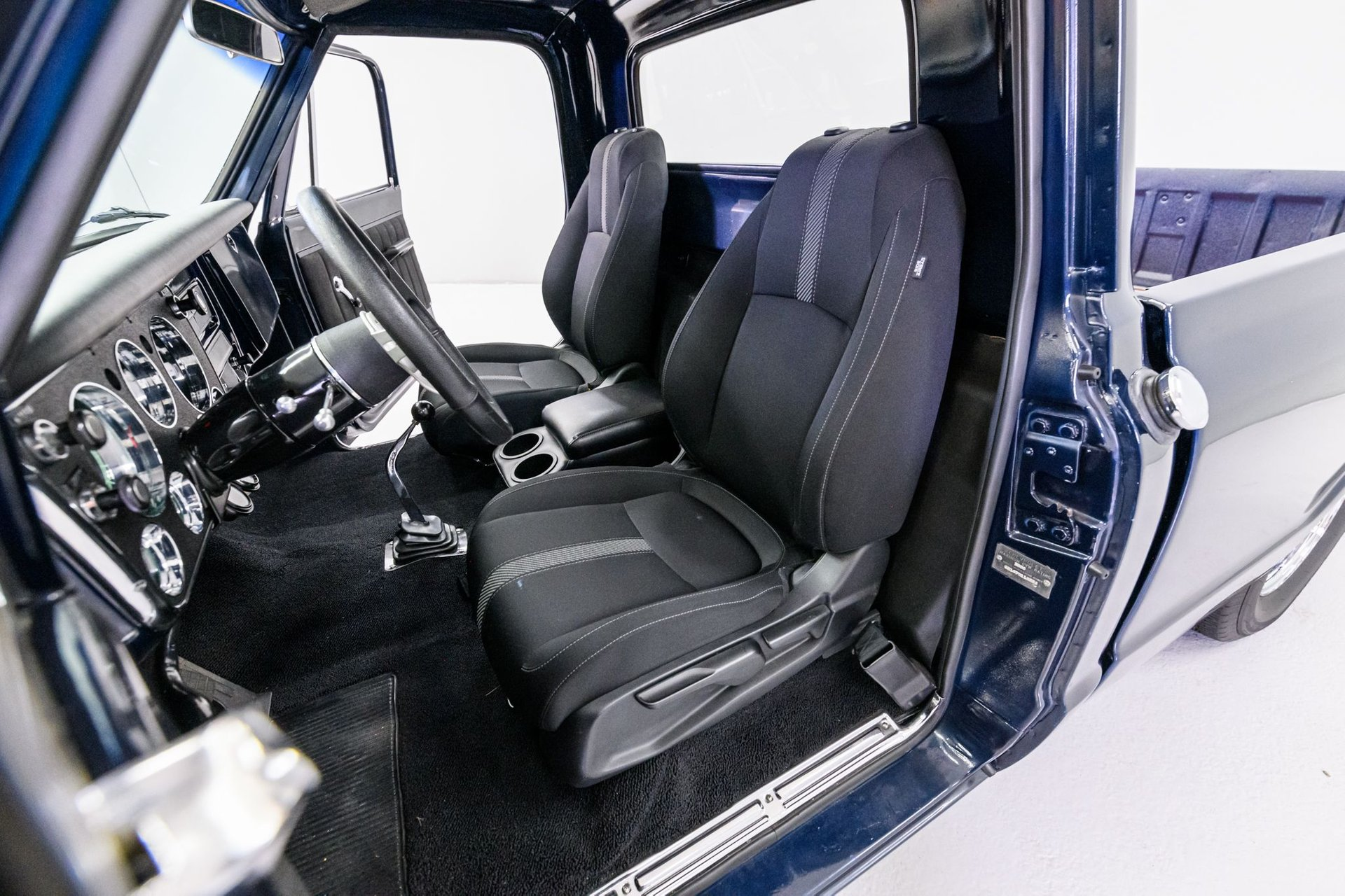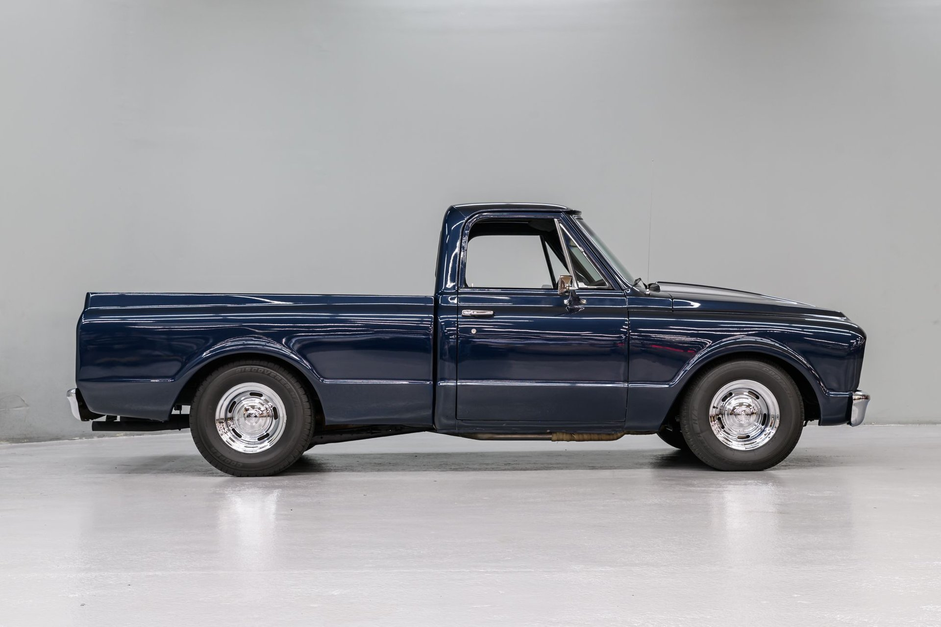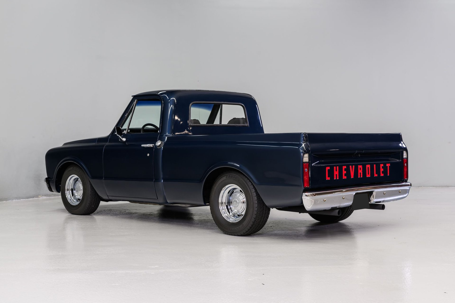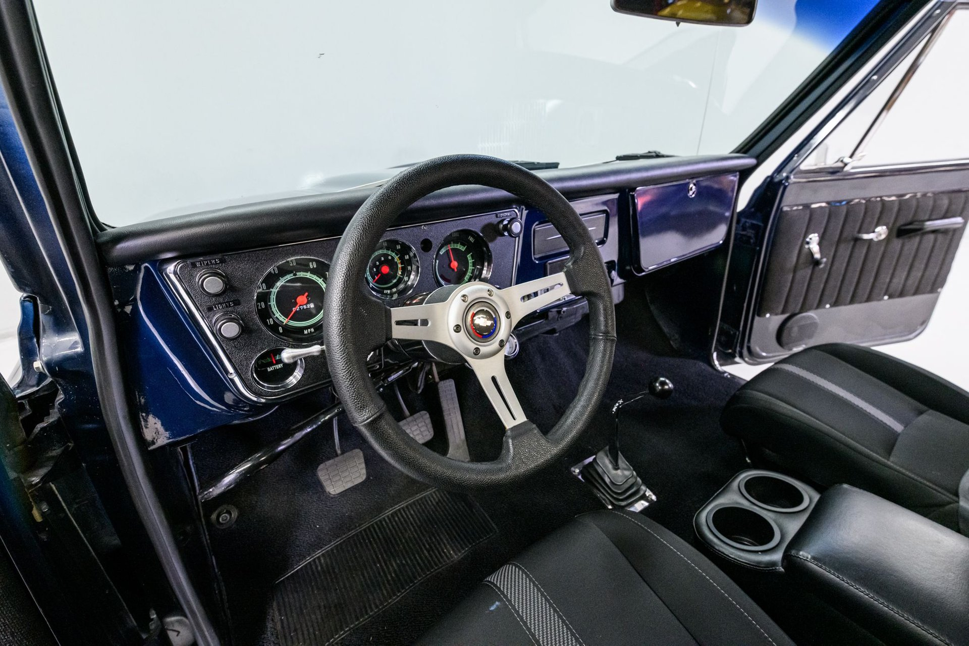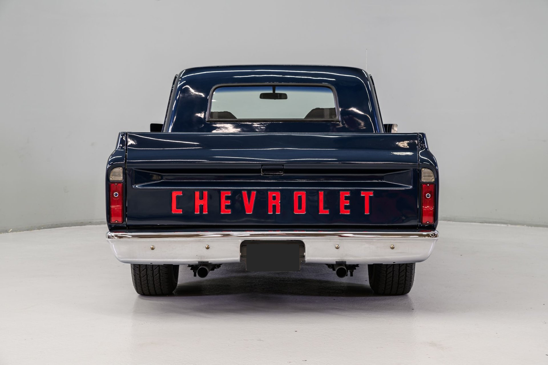Chevrolet referred to the 1967 C-10 pickup as the 'WorkPower' truck. Most were equipped with a 250ci straight six - the big-block Chevy V8 motors were reserved for Impalas, Chevelles and Corvettes. After a total restoration, this 1967 C-10 'Styleside' short-bed, now powered by a 408ci 'Rat”, is a far cry from that six-cylinder model. The straight exterior has been professionally reshot in Nissan Dark Blue - a stunning 2-stage finish w/Z28 hood stripes. A cowl-induction hood has been installed and all chrome/stainless components are excellent. The suspension has been slightly lowered all around and a set of 15” chromed Chevy rally wheels w/center caps mount Cooper performance radial tires. Beautiful cedar wood boards and treated plywood have been installed over the original steel floor of the Rhino-lined bed. The interior has been carefully redone. Bucket sport-seats upholstered in black cloth have been installed along with a center console, matching door cards and a Grant tilt-wheel. A new factory gauge package w/tach has been fitted into the dash along with additional aftermarket gauges. This interior is C-10 'Silverado'.