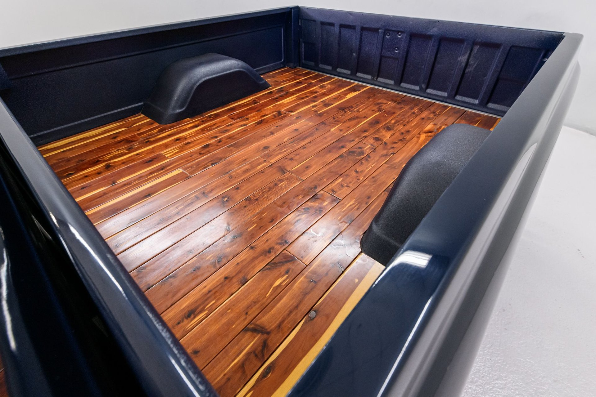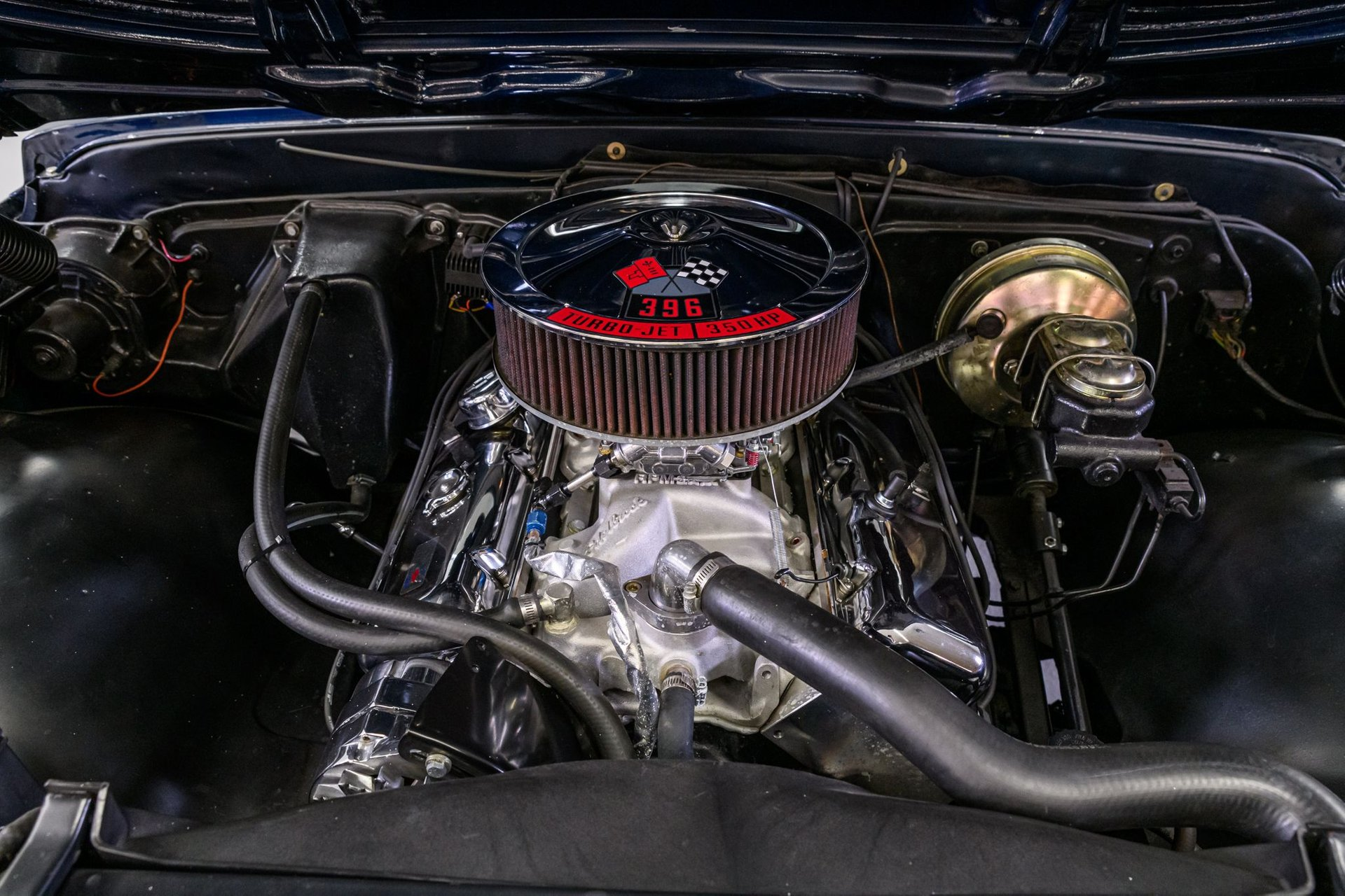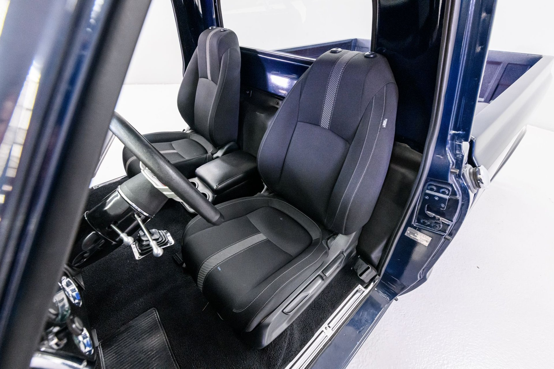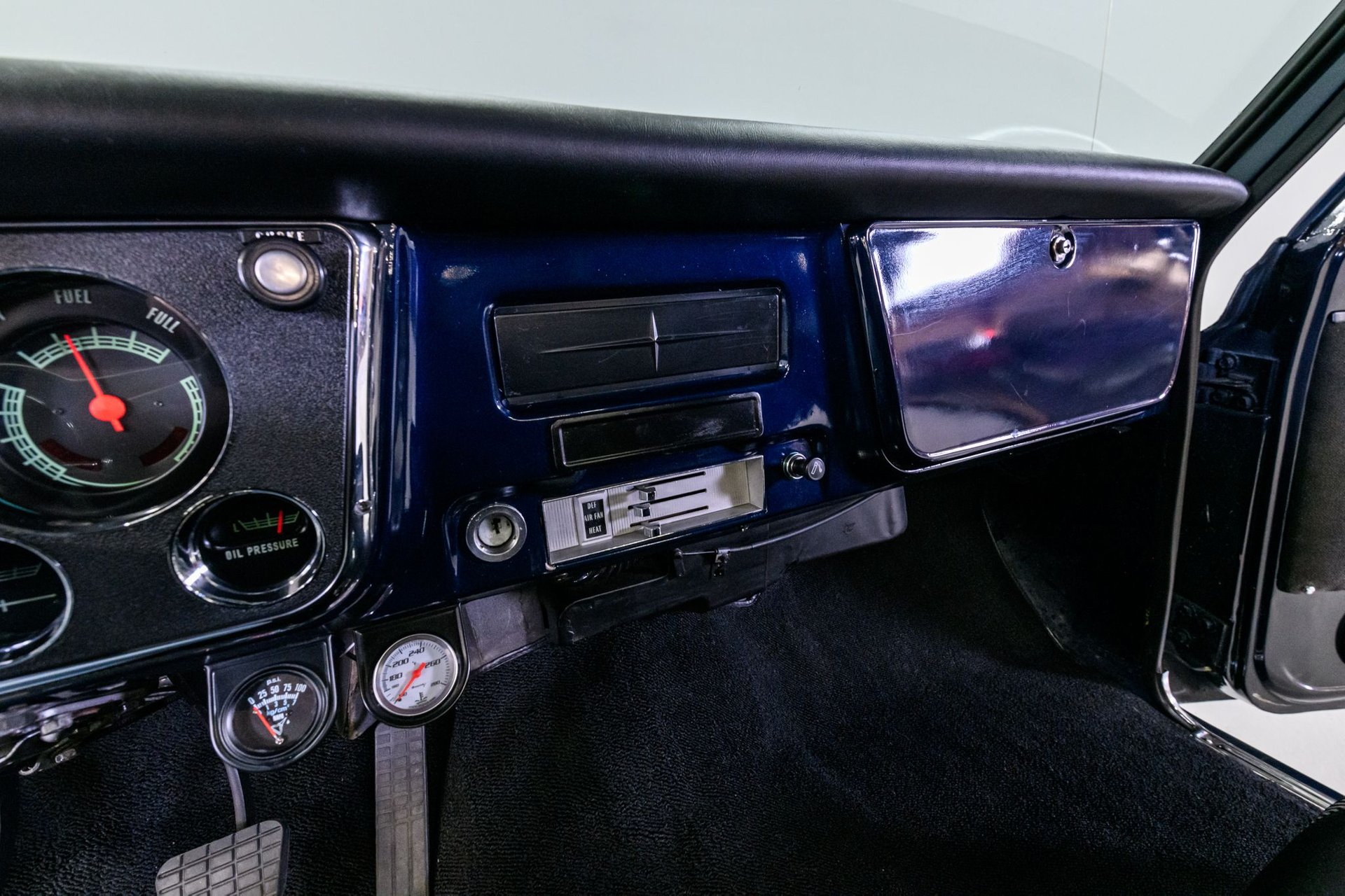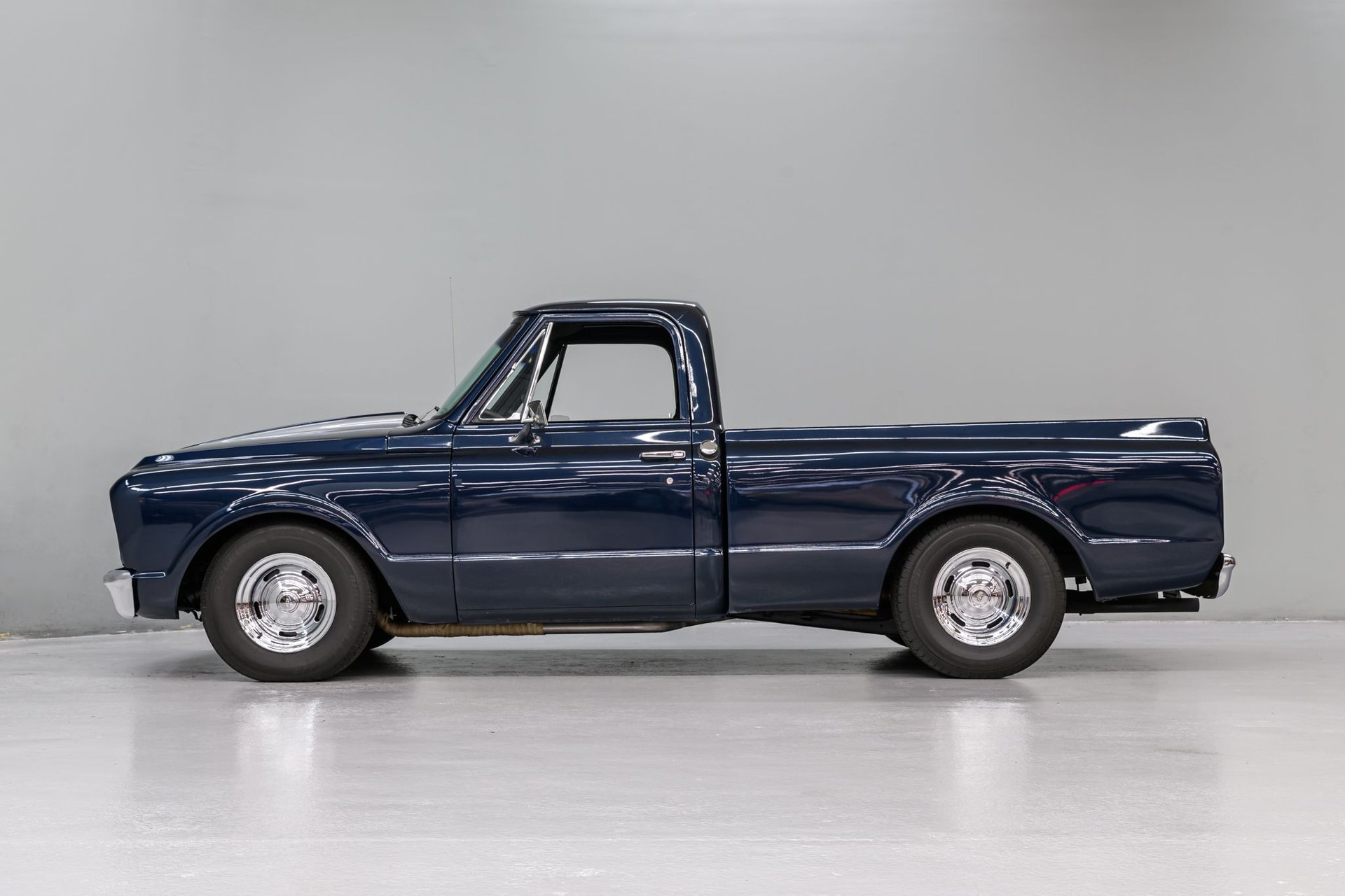 Chevrolet referred to the 1967 C-10 pickup as the 'WorkPower' truck. Most were equipped with a 250ci straight six - the big-block Chevy V8 motors were reserved for Impalas, Chevelles and Corvettes. After a total restoration, this 1967 C-10 'Styleside' short-bed, now powered by a 408ci 'Rat”, is a far cry from that six-cylinder model. The straight exterior has been professionally reshot in Nissan Dark Blue - a stunning 2-stage finish w/Z28 hood stripes. A cowl-induction hood has been installed and all chrome/stainless components are excellent. The suspension has been slightly lowered all around and a set of 15” chromed Chevy rally wheels w/center caps mount Cooper performance radial tires. Beautiful cedar wood boards and treated plywood have been installed over the original steel floor of the Rhino-lined bed. The interior has been carefully redone. Bucket sport-seats upholstered in black cloth have been installed along with a center console, matching door cards and a Grant tilt-wheel. A new factory gauge package w/tach has been fitted into the dash along with additional aftermarket gauges. This interior is C-10 'Silverado'.