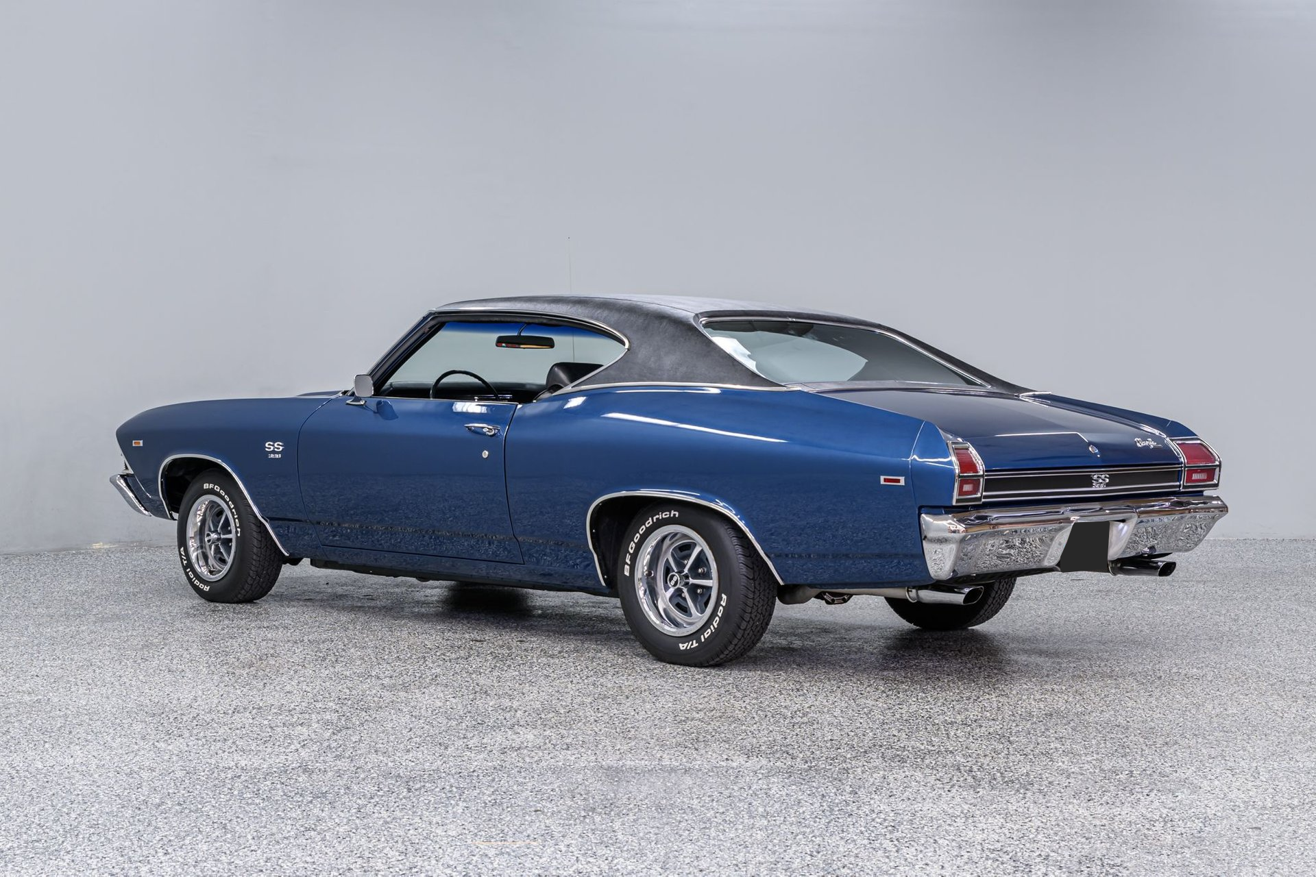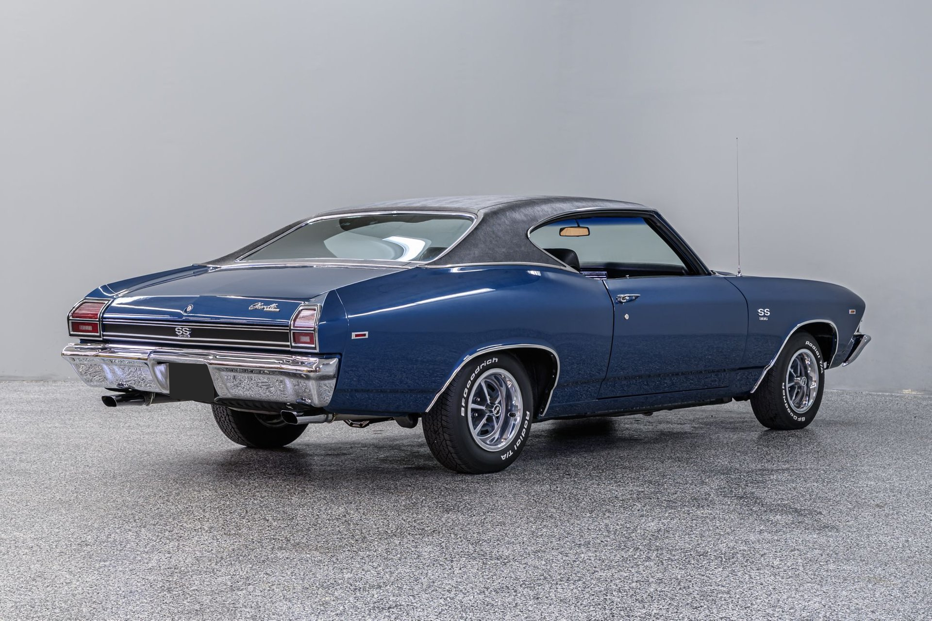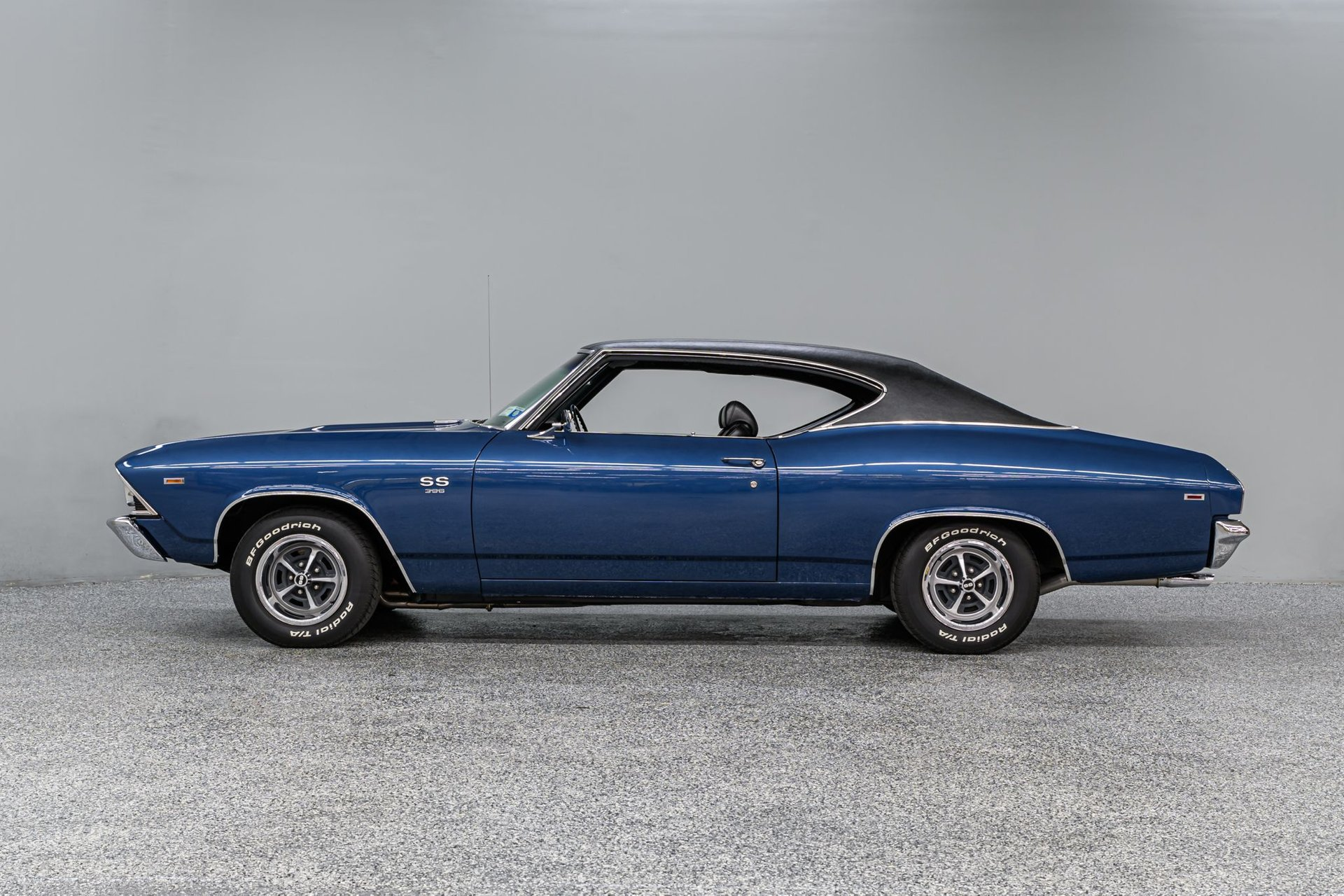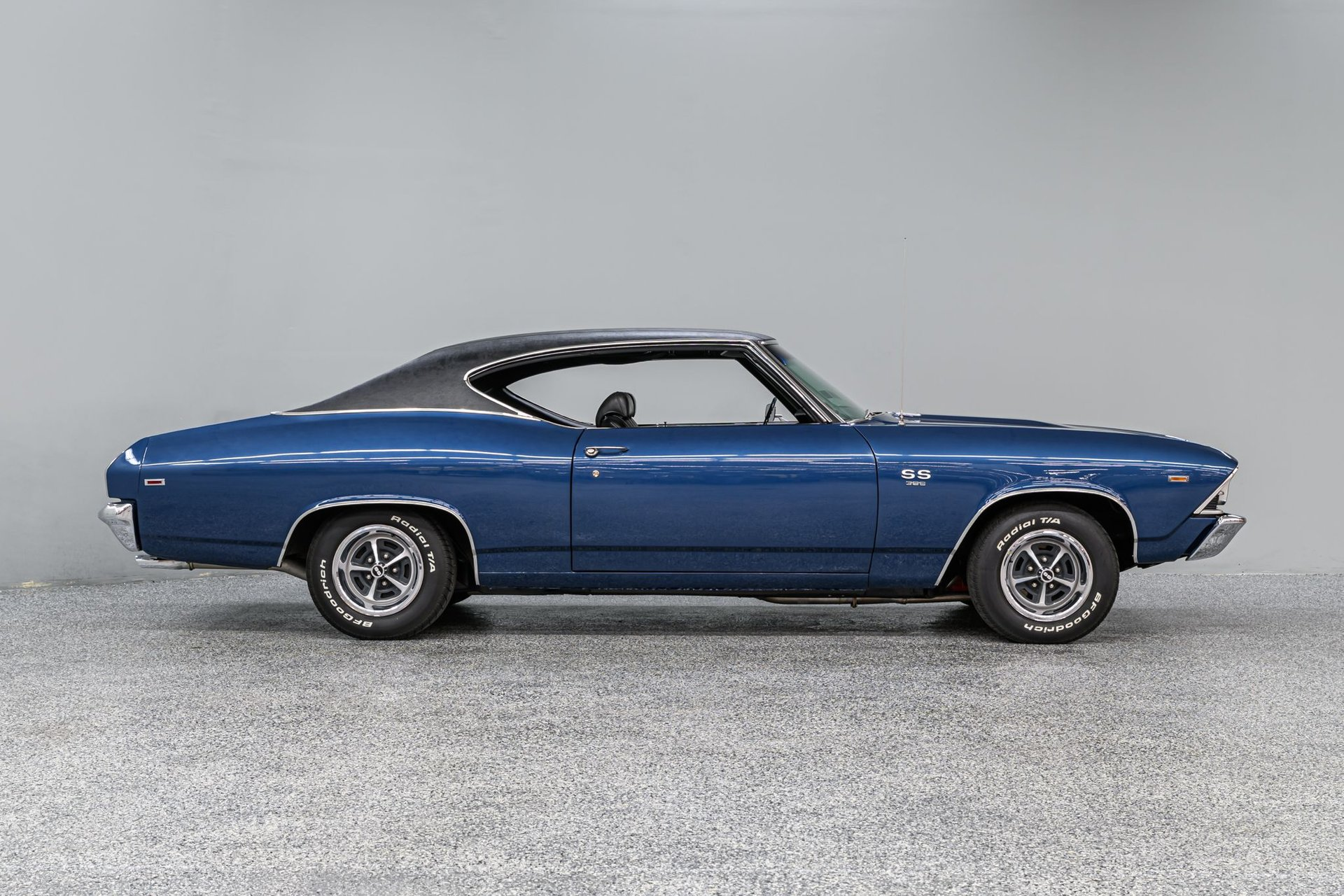 The 2nd generation Chevelle SS396 has become one of the most popular muscle cars ever built. The current owner of this Chevelle has had it for the last 25 years and states that it is a true SS396. A '69 Chevelle can be a somewhat difficult car to positively identify as a factory SS396 due to the fact that the SS396 was simply an option code (RPO Z25) on the Malibu model, not identified in the VIN sequence as a '138 code' as were previous models. That said, the engine in this Chevelle is stamped with the matching VIN number including the 'JA' code (unique to the '69 SS396 Chevelle). Every other SS element of this car also appears to be 100% authentic. A full restoration has been performed on this beautiful SS396 and the attention to detail is precise. The body was professionally resprayed in original Dusk Blue (code 51) with a new contrasting black vinyl top and the chrome and stainless pieces are excellent. All SS396 badging is correct, as are the 14” Chevelle Rally II wheels w/caps that mount BFGoodrich T/A radials. A custom car cover is also included in the sale. The interior was reupholstered in black vinyl with bucket seats, console, Muncie shifter and the correct SS396 'pod' gauge package. A factory AM radio resides in the dash. The matching numbers 396ci/325hp 'Rat' was totally rebuilt and a mild cam and Edelbrock aluminum intake were added. A Rochester Quadrajet provides carburation and exhaust is routed through tube-headers to a free-flowing system. The transmission is a close-ratio M-21 Muncie and a 12-bolt positraction differential is fitted with factory street gearing (probably 3.31:1 or similar with the 4-speed). Power-assisted disc/drum brakes control stopping. Our Chevelle SS396 is a stunning example of this classic muscle car and will greatly improve the value of your garage.