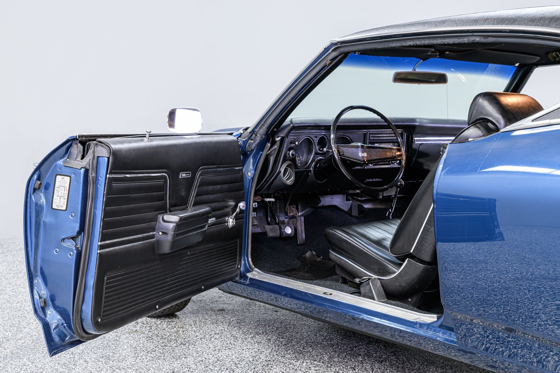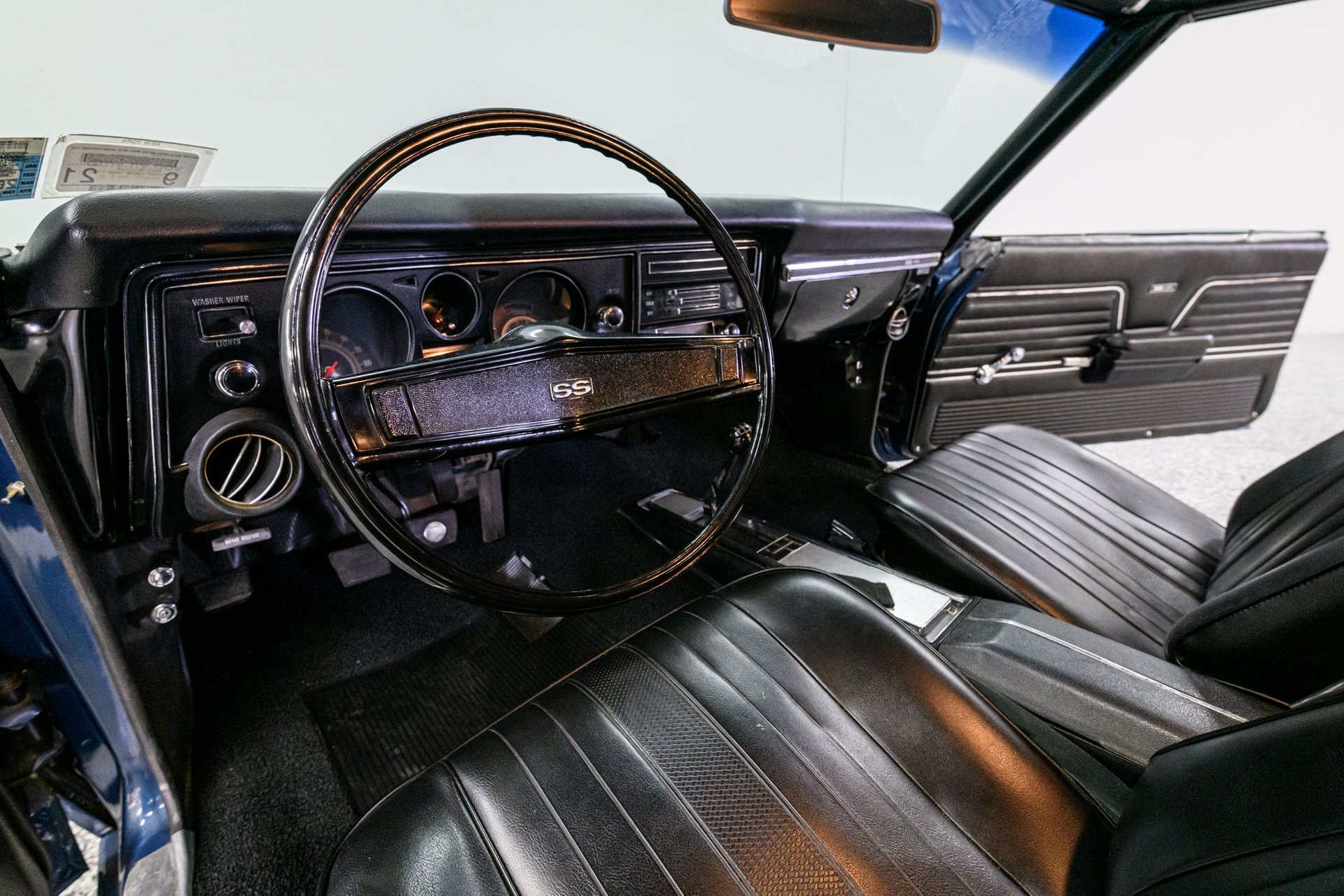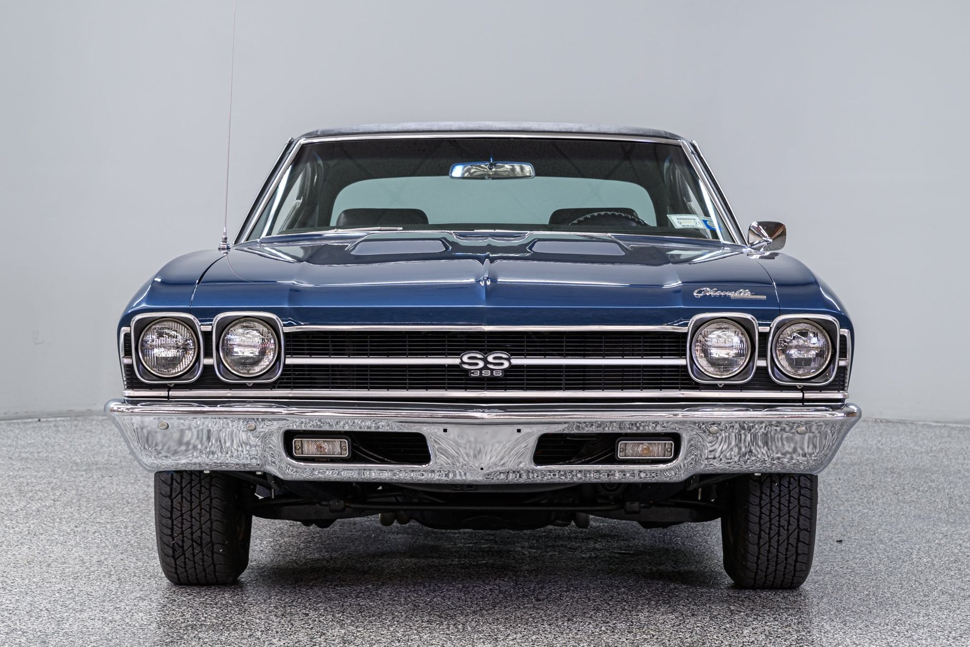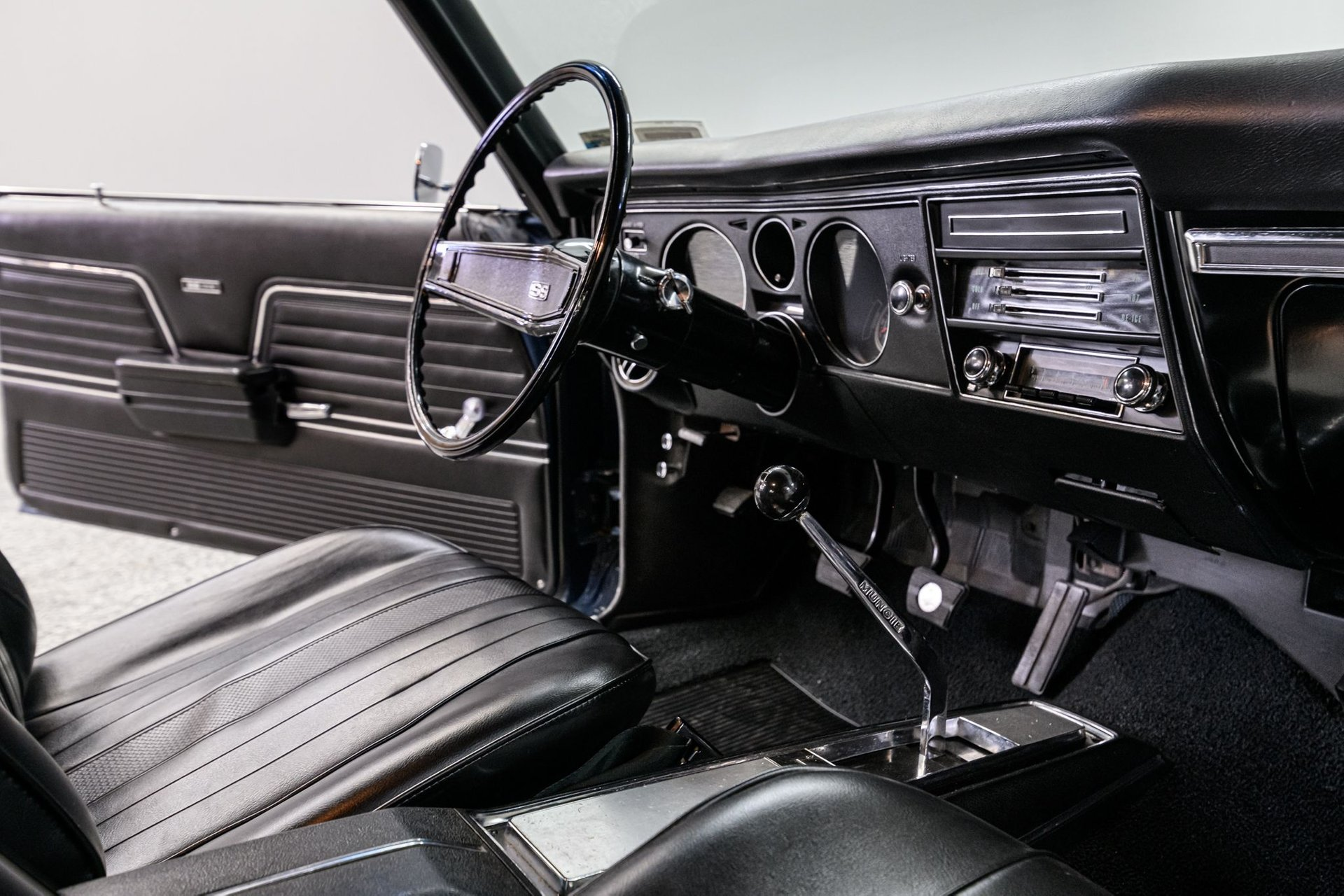 The 2nd generation Chevelle SS396 has become one of the most popular muscle cars ever built. The current owner of this Chevelle has had it for the last 25 years and states that it is a true SS396. A '69 Chevelle can be a somewhat difficult car to positively identify as a factory SS396 due to the fact that the SS396 was simply an option code (RPO Z25) on the Malibu model, not identified in the VIN sequence as a '138 code' as were previous models. That said, the engine in this Chevelle is stamped with the matching VIN number including the 'JA' code (unique to the '69 SS396 Chevelle). Every other SS element of this car also appears to be 100% authentic. A full restoration has been performed on this beautiful SS396 and the attention to detail is precise. The body was professionally resprayed in original Dusk Blue (code 51) with a new contrasting black vinyl top and the chrome and stainless pieces are excellent. All SS396 badging is correct, as are the 14” Chevelle Rally II wheels w/caps that mount BFGoodrich T/A radials. A custom car cover is also included in the sale. The interior was reupholstered in black vinyl with bucket seats, console, Muncie shifter and the correct SS396 'pod' gauge package. A factory AM radio resides in the dash. The matching numbers 396ci/325hp 'Rat' was totally rebuilt and a mild cam and Edelbrock aluminum intake were added. A Rochester Quadrajet provides carburation and exhaust is routed through tube-headers to a free-flowing system. The transmission is a close-ratio M-21 Muncie and a 12-bolt positraction differential is fitted with factory street gearing (probably 3.31:1 or similar with the 4-speed). Power-assisted disc/drum brakes control stopping. Our Chevelle SS396 is a stunning example of this classic muscle car and will greatly improve the value of your garage.
